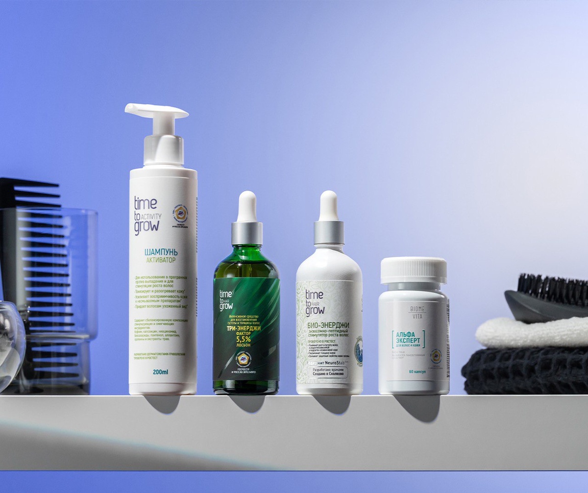 Набор предназначен для стимуляции роста и восстановления густоты волос при выпадении, выраженном поредении и истончении, включая различные формы алопеции, в том числе андрогенетическую. Средства в составе набора обеспечивают снижение выпадения, укрепление фолликулов, стимуляцию роста волос, оказывают антиандрогенное действие. Официальный сайт: https://time-to-grow.pro/