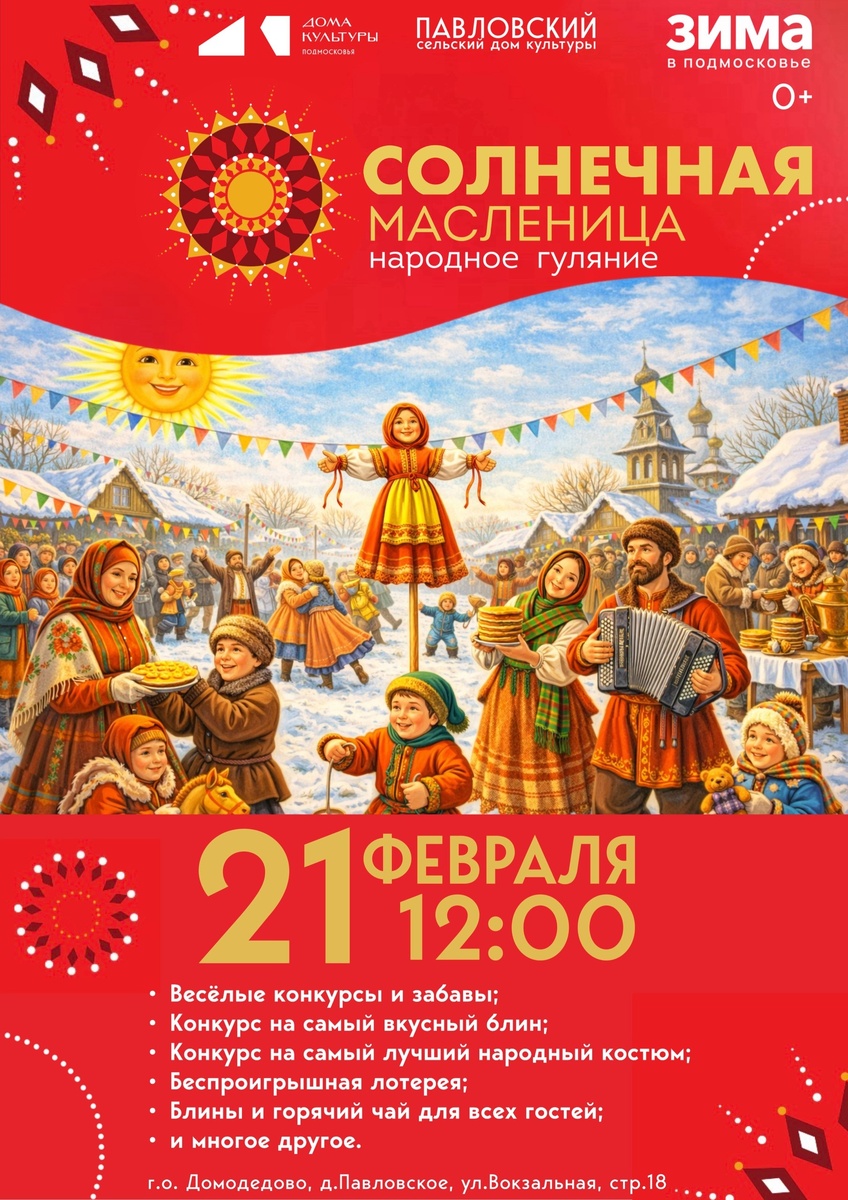 ✨ 🌞 Масленица в Павловском! 🌞 Что ждёт вас на празднике? ✨ Выступление творческих коллективов — зарядимся настроением вместе! ✨ Весёлые конкурсы и забавы для детей и взрослых🤩 ✨ Конкурс хозяек на самый вкусный блин — попробуйте шедевры местных кулинаров! ✨ Конкурс на самый лучший народный костюм — покажите своё мастерство и креативность! ✨ Беспроигрышная лотерея — у каждого есть шанс выиграть приятный сюрприз! ✨ Блины и горячий чай для всех гостей — вкусно и по‑домашнему. ✨ Фотозоны — сохраните яркие моменты праздника в красивых кадрах 🚫 Возраст: 0+ 📆 21.02.2026🕒12:00 🏢 Павловский сельский дом культуры (СДК) 📍 г.о.Домодедово, дер.Павловское, ул.Вокзальная, д.18 💰 Вход свободный❗️ ✅ Мероприятия Домодедово https://dzen.ru/id/66f10385cc4c5a16f7b5fb02 http://vk.com/domodedovo_events http://dzen.ru/domodedovo_events