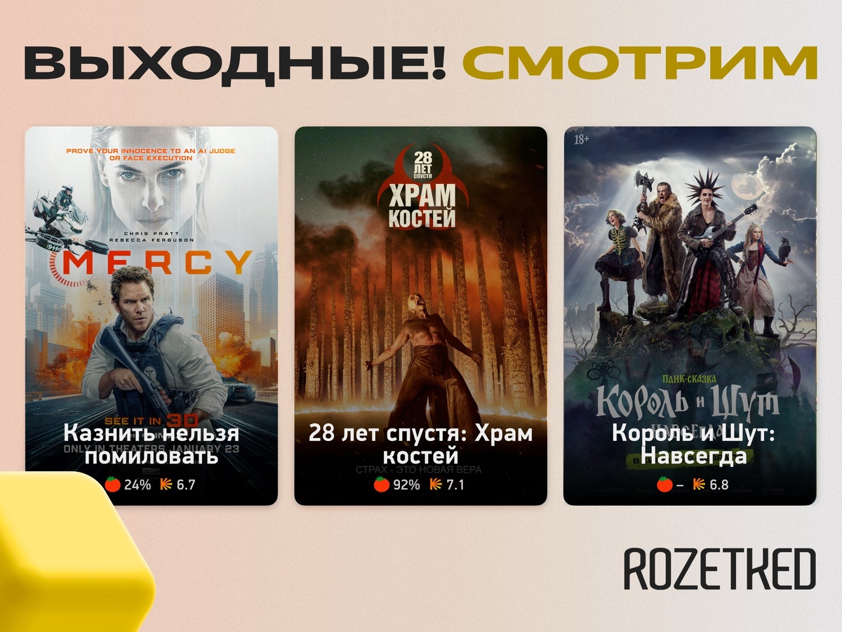 Вечер. Свежее кино 📺 › Детектив «Казнить нельзя помиловать» от Тимура Бекмамбетова об ИИ в роли судьи. Вышел на цифровых площадках. › «28 лет спустя: Храм костей» — новая часть легендарного хоррора. Тоже в цифре. › Полнометражный «Король и Шут. Навсегда» дебютировал в прокате. 💼 Rozetked | Подписаться