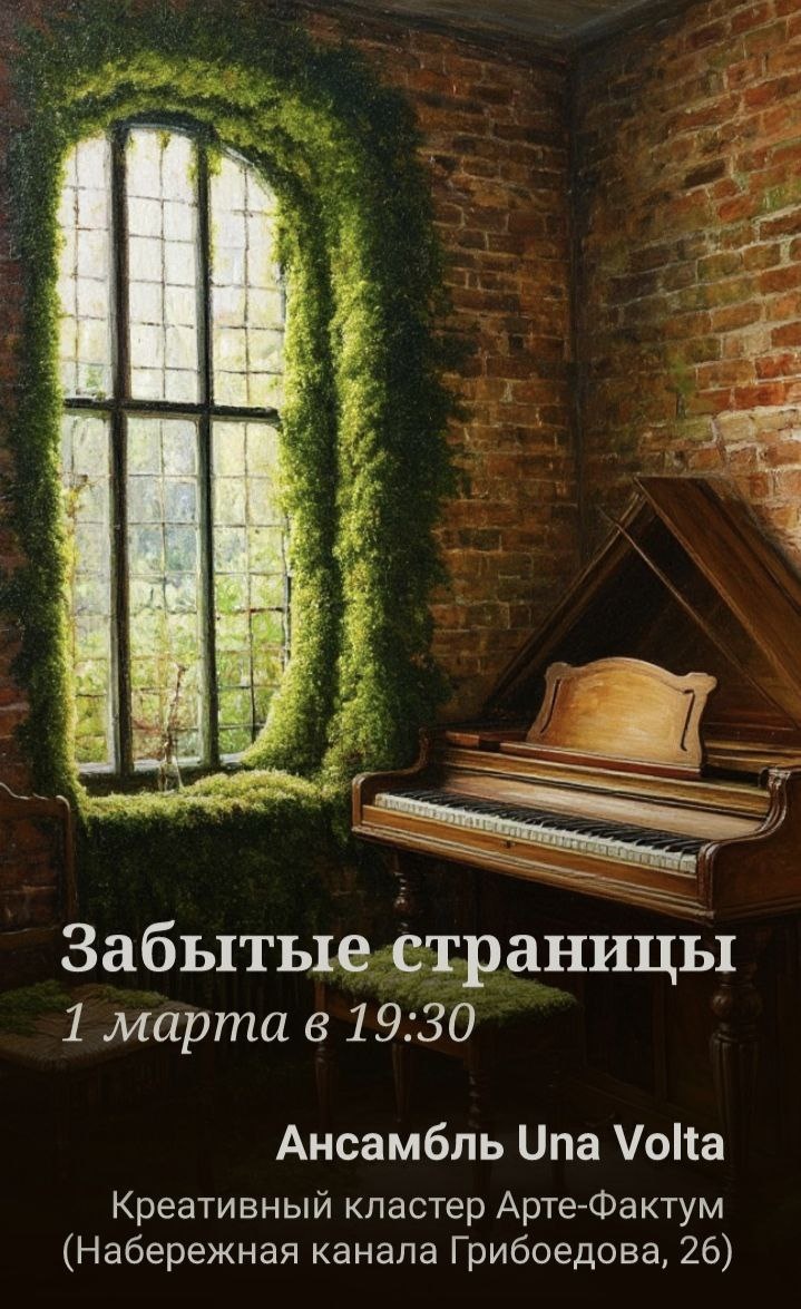 1 марта в 19:30 Креативный кластер Арте-Фактум (Набережная канала Грибоедова, 26) Удивительно, сколько прекрасных произведений искусства, достойных того, чтобы быть известными на весь мир исчезает во тьме прошлых эпох. Удивительно, как редко их открывает для себя слушатель и зритель. Приглашаем вас на концерт, на котором это открытие совершается. Здесь можно увидеть жемчужину, подержать ее на ладони и, восхитившись, рассказать миру какая она. Ансамбль Una Volta исполнит музыку Георга Филиппа Телемана, современника и друга Иогана Себастьяна Баха. Музыку, которую так редко исполняют, что совершенно неясно, звучала ли она когда-то до этого в Петербурге. В программе концерты для клавесина и аккомпанирующего инструмента (флейты или скрипки), дуэт флейты и скрипки и триосоната для камерного состава. Билеты вы можете найти тут: https://klub-una-volta.timepad.ru/event/3832175/