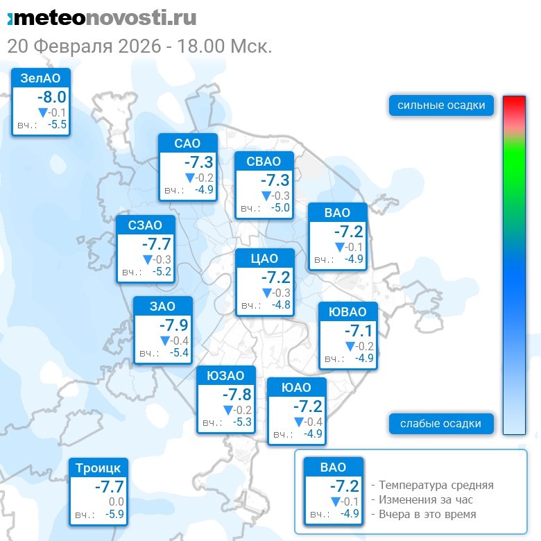 В 18:00 в Москве было от -8.6°C до -6.4°C, средняя температура -7.4°C #погода #Москва #зима #температура #20февраля #пятница