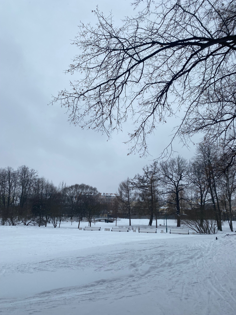 Зимняя метель скрывает живописные черты Таврического сада, сейчас стоящим без зелени и солнечного света.