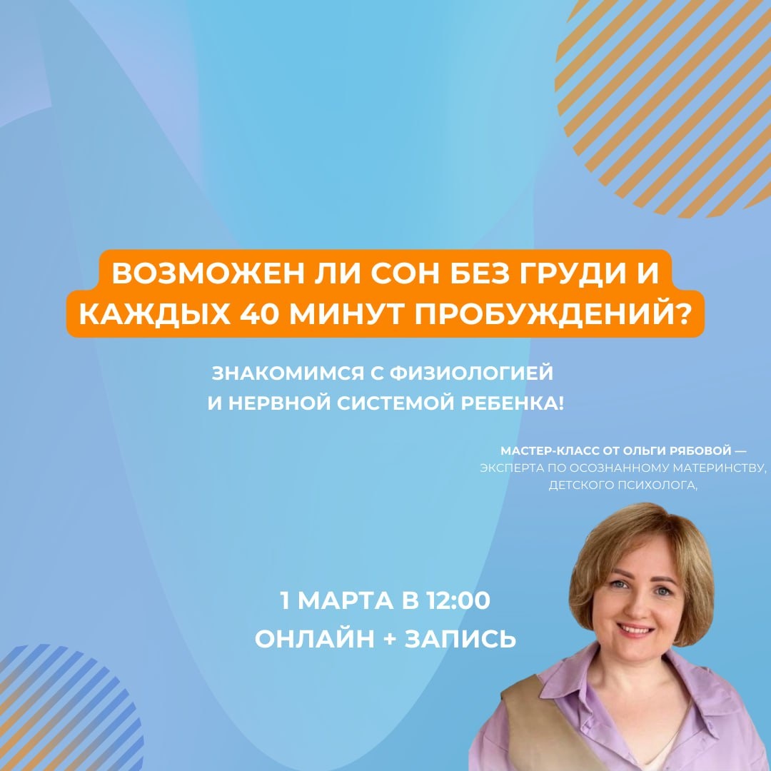 ! «ВОЗМОЖЕН ЛИ СОН БЕЗ ГРУДИ И КАЖДЫХ 40 МИНУТ ПРОБУЖДЕНИЙ?» Рекомендую вам выделить время 1 марта. Если вы устали… — «Просыпается каждые 40 минут и просит грудь», — «Ночью уснул — через 5–15 минут снова проснулся», — «Я уже не сплю и очень устала». Я вас очень понимаю. 🙏🏻 И точно рекомендую посетить данный мастер-класс! И сразу важно сказать честно: это не мастер-класс в формате «сейчас починим вашего ребёнка за один вечер». Сон — это не кнопка. Это физиология, развитие нервной системы, возрастные скачки, фазы сна и эмоциональное состояние ребёнка (и мамы). На мастер-классе мы: ✔️ разберём фазы сна — что такое «склеивание циклов» и почему 40 минут это часто норма, ✔️ обсудим, что действительно является нормой по возрасту, а что требует внимания, ✔️ разберём мифы о «сам должен спать всю ночь», ✔️ поговорим о сне с учётом психологии и развития ребёнка, ✔️ поймём, куда стоит направлять усилия, а куда — нет. Моя задача — не дать волшебную таблетку, а помочь вам понять потребности