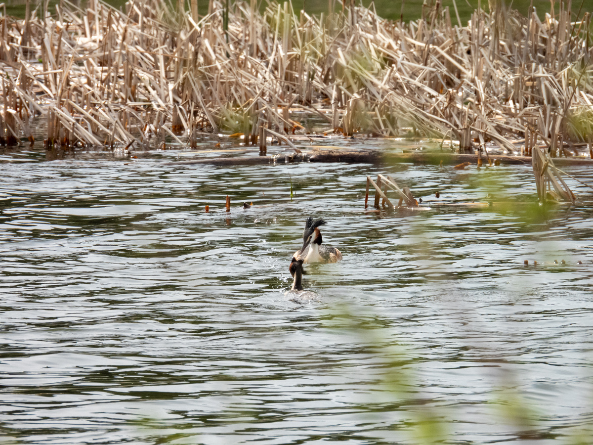 В середине мая, едва растает лед, придя на берег озера, можно услышать знакомые звуки: «круа», «корр». Значит, прилетели! Присматриваюсь к прошлогодним зарослям камыша (на самом деле рогоза) и нахожу взглядом парочки. Женихи и невесты встречаются, танцуют, ухаживают друг за другом. Так красиво и трогательно. Романтика. Но это только мы, люди, можем позволить себе медовый месяц. Сибирское лето коротко, надо всё успеть. Пока одни еще только танцуют, другие уже приступили к сооружению гнезда. У чомг полное равноправие. Всеми семейными делами одинаково занимаются оба родителя. Сооружают плавучее гнездо из тростника. По очереди высиживают яйца. Ловят рыбу. Когда один сидит на гнезде, второй приносит ему еду. Когда супруг рядом, можно и вздремнуть. А всего интереснее наблюдать за чомгами, когда появляются птенцы. Маленькие полосатые птенчики ездят на спине у мамы. А папа в это время ловит рыбку — посмотрите видео в конце. Если поймает, кормит не только птенцов, но и супругу, ведь она сейчас