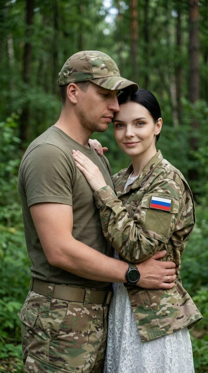 Не меняя внешности людей с фото, на снимке пара в военной форме нежно обнимается на фоне размытых зелёных деревьев. Мужчина повернут лицом вправо, слегка опуская голову к женщине, взгляд задумчивый. Он в оливково-зелёной футболке, камуфлированных брюках расцветки мультикам с широким ремнём и тёмных часах на запястье, голова частично в тени от камуфляжной кепки той же расцветки. Женщина стоит вплотную, лицо к зрителю с лёгкой улыбкой и доброжелательным взглядом, её правая рука на плече мужчины, левая на его груди, выражая тепло и привязанность. Волосы аккуратно уложены. Она в камуфляжной куртке с нашивкой флага России на рукаве, под ней белое платье с тонким кружевом, создавая контраст текстур. Дневной прохладный свет мягко подчёркивает зелень заднего плана. Атмосфера теплая, спокойная, с эмоциональной глубиной, фотореалистичное изображение, высокая детализация, 8K разрешение.