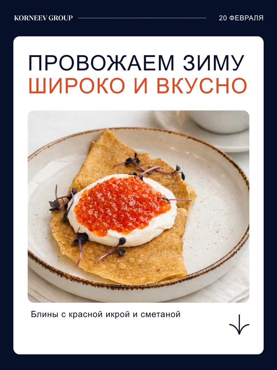 Золотистое кружевное тесто, соленая икра и капля прохладной сметаны. Идеальная пара к чашке кофе или бокалу ледяного игристого, прежде чем отправиться на посадку.