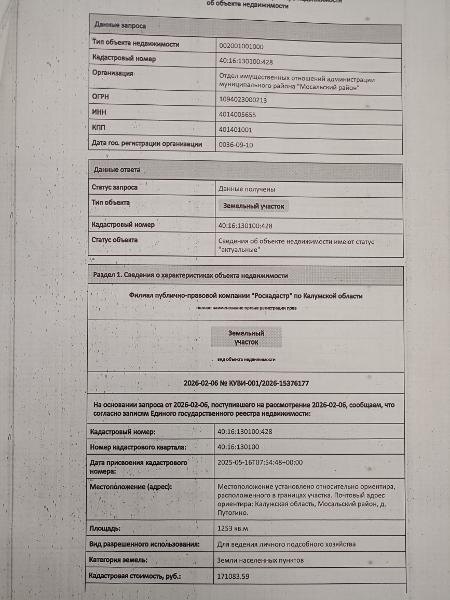 Название: Земельный участок с кадастровым номером 40:16:130100:428 площадь 1253 по адресу Калужская область, Мосальский район, д