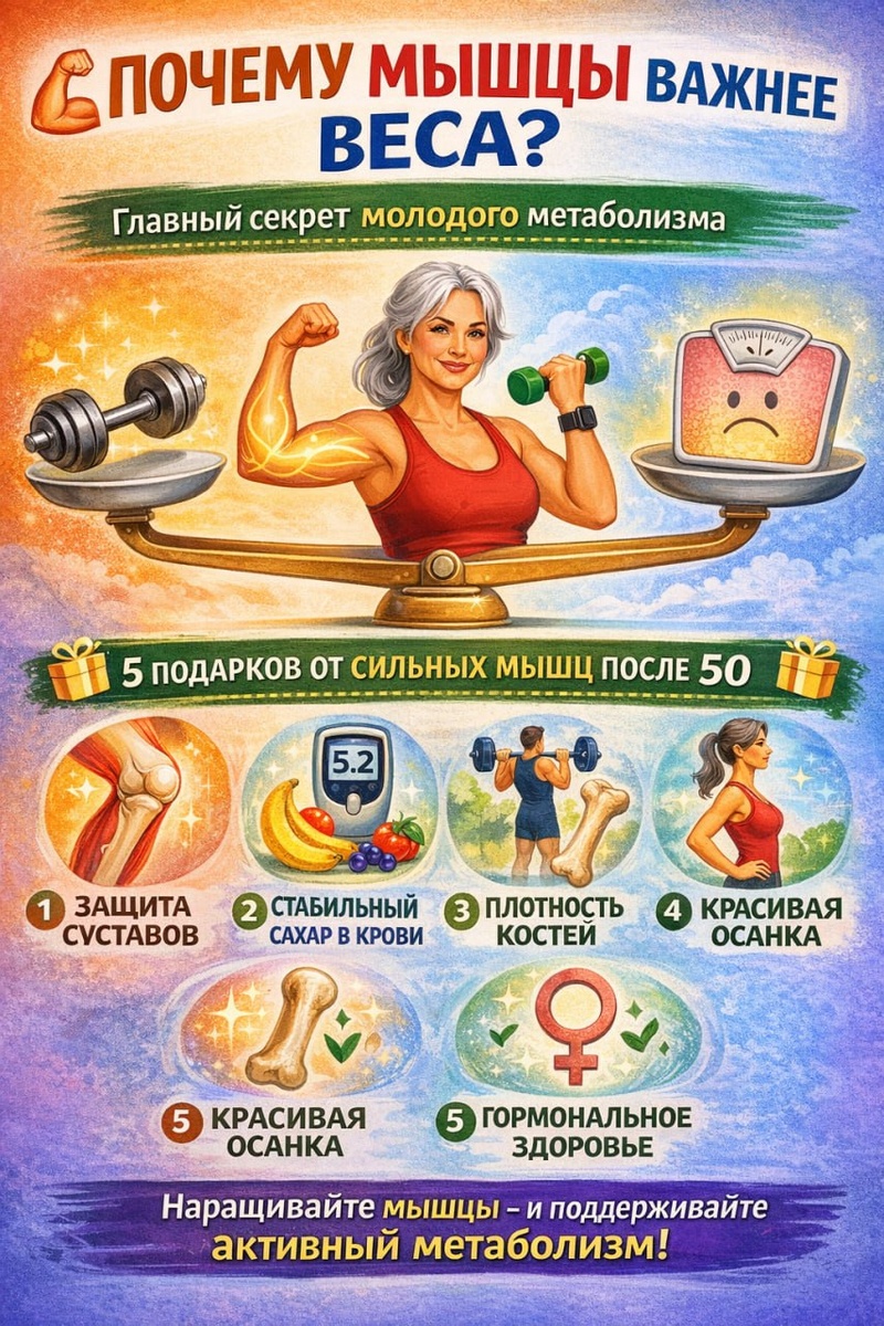 💪 ПОЧЕМУ МЫШЦЫ ВАЖНЕЕ ВЕСА? Главный секрет молодого метаболизма С возрастом мы незаметно теряем мышечную массу. После 30 лет этот процесс ускоряется, а после 50 — особенно у женщин на фоне гормональных изменений — мышцы уходят быстрее. ‼️Казалось бы, ну и что? Меньше мышц — меньше вес, стройнее фигура? Нет, всё с точностью до наоборот. Мышцы — это ваш «личный реактор» энергии. Даже когда вы просто сидите, мышцы сжигают калории. Чем меньше мышц, тем медленнее метаболизм. И вес начинает приходить буквально «от запаха еды». 🎁 5 подарков от сильных мышц после 50: 💪ЗАЩИТА СУСТАВОВ. Крепкий мышечный корсет удерживает суставы в правильном положении. Болят не суставы — болят слабые мышцы вокруг них. 💪СТАБИЛЬНЫЙ САХАР В КРОВИ. Мышцы — главные потребители глюкозы. Чем их больше, тем меньше сахара гуляет по