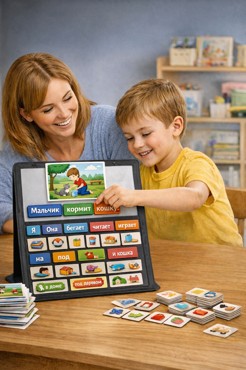 Достали наш фразовый конструктор, и я даже не ожидала, что он так увлечет ребенка. Суть простая: есть сюжетные картинки и отдельные плашки со словами. Нужно составить предложение, глядя на сюжет.