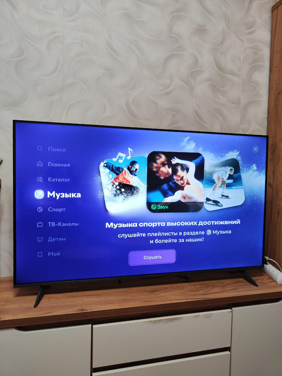Аудиосистема телевизора представлена двумя динамиками суммарной мощностью 20 Вт с поддержкой технологии Dolby Audio. Звук чистый, с хорошим запасом громкости. Для типичной городской квартиры или спальни этого более чем достаточно. Басы, конечно, не такие глубокие, как мог бы дать отдельный саундбар, но голоса и верхи звучат четко и разборчиво. Если вы хотите по-настоящему кинематографического погружения, всегда можно вывести звук через HDMI eARC на внешнюю акустику.
