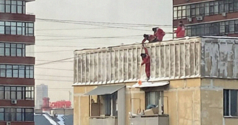 Московские коммунальщики снова показывают цирковые трюки. Канал «Изнанка Москвы» опубликовал фото, от которого кровь стынет в жилах. Сюжет такой: на крыше несколько коммунальщиков в оранжевой форме, один перелез через парапет и стоит на узком пространстве прямо над козырьком балкона, опасно балансируя, и метелкой аккуратно счищает снег. Двое наверху страхуют его буквально руками — держат почти за мизинчик. Ни тросов, ни страховки не видно. Высота приличная. Несколько дней назад СМИ уже писали о похожей сцене — тогда семеро мужчин без страховки скользили по заснеженной крыше четырехэтажки, сбрасывая сугробы вниз. «Вот хожу я каждые полчаса и считаю их — вдруг на одного меньше станет», — нервно шутили очевидцы. Обошлось, к счастью, без трагедий. А сегодня к этой коммунальной хронике добавился еще один эпизод. Блогер Мария Миногарова рассказала, как рабочий внезапно появился у нее на балконе, счищая наледь прямо напротив окна. «Я чуть не упала, когда увидела, что у нас на балконе кто-то с