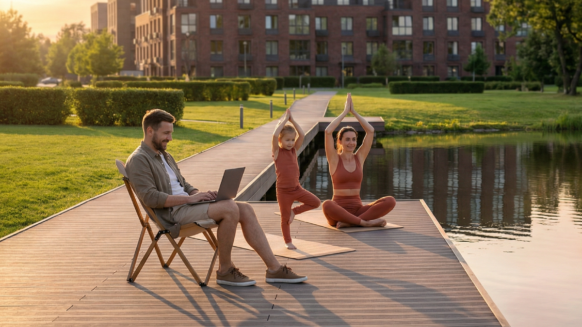 Для тех, кто работает онлайн, расстояние — вообще не фактор. Наоборот, удалённость помогает легче переносить ритм цифровых профессий. Например, в тёплое время можно выйти с ноутбуком на пирс у озера или даже в собственное патио, если квартира на первом этаже. Здесь легче переключаться, чем в шумном городе, где вокруг пробки, людные кафе, а до ближайшего коворкинга — пять станций метро.