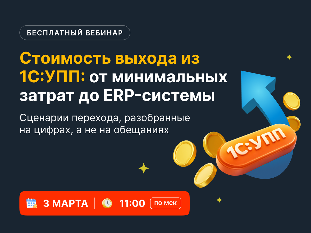 Эксперты Инфостарт и ERP Band приглашают на бесплатный вебинар о переходе с 1С:УПП. Без теории и «общих слов»: сравним сценарии на цифрах, покажем скрытые и отложенные затраты и разберем финансовые и архитектурные последствия каждого варианта – регистрируйтесь и приходите на прикладной разбор. 3 марта 2026 года команда Инфостарт совместно с ERP Band проведет бесплатный вебинар «Стоимость выхода из 1С:УПП: от минимальных затрат до ERP-системы». Цель встречи – помочь руководителям и командам принять решение о переходе, не переоценив «дешевый» старт и не столкнувшись с переплатами через 1–2 года. Компании на 1С:УПП все чаще оказываются в ситуации, когда «дотянуть как есть» кажется экономией – но на практике приводит к росту рисков и затрат: усложняется поддержка, накапливается техдолг, повышается цена изменений, увеличивается ручной труд и зависимость от «костылей». Часто бизнес сталкивается с такими последствиями: Разберем: Сравним подходы и их последствия: Покажем на практике: Собственн