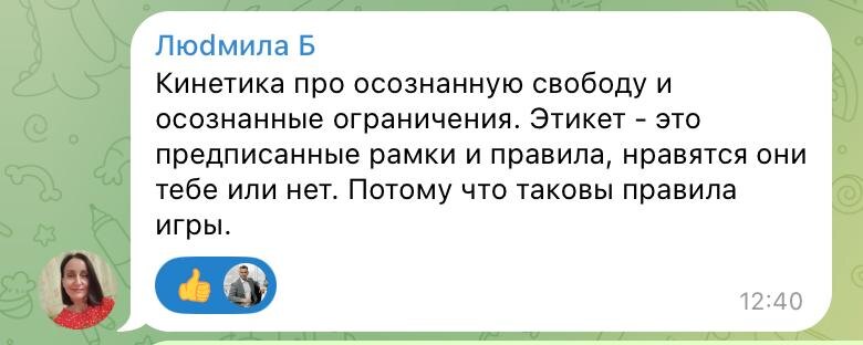 Как интересно, а кинетика это точно про ограничения или про уместность? Как мы мыслим: что нам вот тут нельзя проявляться как-то или что в этой же ситуации уместно вот так? Мы про красный маркер или про зеленый?