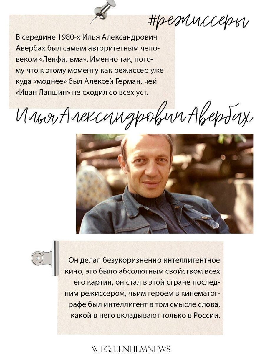 🎞️ Сегодня мы поговорим об Илье Александровиче Авербахе — ➕Изысканный и чувственный, он был гением, когда это слово еще не потеряло весь заложенный в него этимологический смысл. Почти все, кто писал о нем в дневниках или же некрологах, особенно часто повторяли слова «артистичный» и «элегантный»⭐️ Среди его работ такие фильмы, как: 😀«Степень риска», 1968г. 😀«Чужие письма», 1975г. 😀«Драма из старинной жизни», 1971г. 😀«Объяснение в любви», 1977г. #РежиссерыЛенфильма