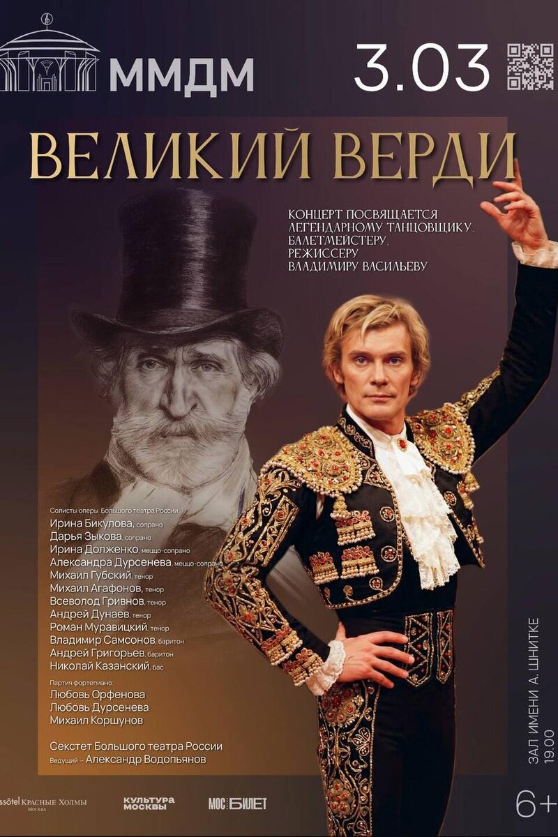 В Доме музыки пройдет вечер «Великий Верди» Двум великим деятелям культуры будет посвящен вечер в Доме музыки. В программу, в которой выступят звезды оперы Большого театра, вошли арии и дуэты из разных опер Джузеппе Верди. Без произведений этого композитора невозможно представить сам жанр оперы. Музыку Верди отличает невероятная красота и эмоциональная насыщенность, ее обожают слушать зрители мире и петь вокалисты во всем мире. Лучшие фрагменты из знаменитых опер великого итальянца прозвучат в этот вечер. А посвящена программа легендарному танцовщику 20 века Владимиру Васильеву, которого часто называют «гением танца» Кстати, Владимир Викторович имеет прямое отношение к творчеству Верди (при том, что этот композитор балетов не писал). В свое время Васильев станцевал роль матадора в фильме-опере «Травиата» в постановке Дзеффирелли и у этого же режиссера поставил хореографические сцены в спектакле «Аида». А ровно тридцать лет назад Васильев стал режиссером новой постановки «Травиаты» в Б