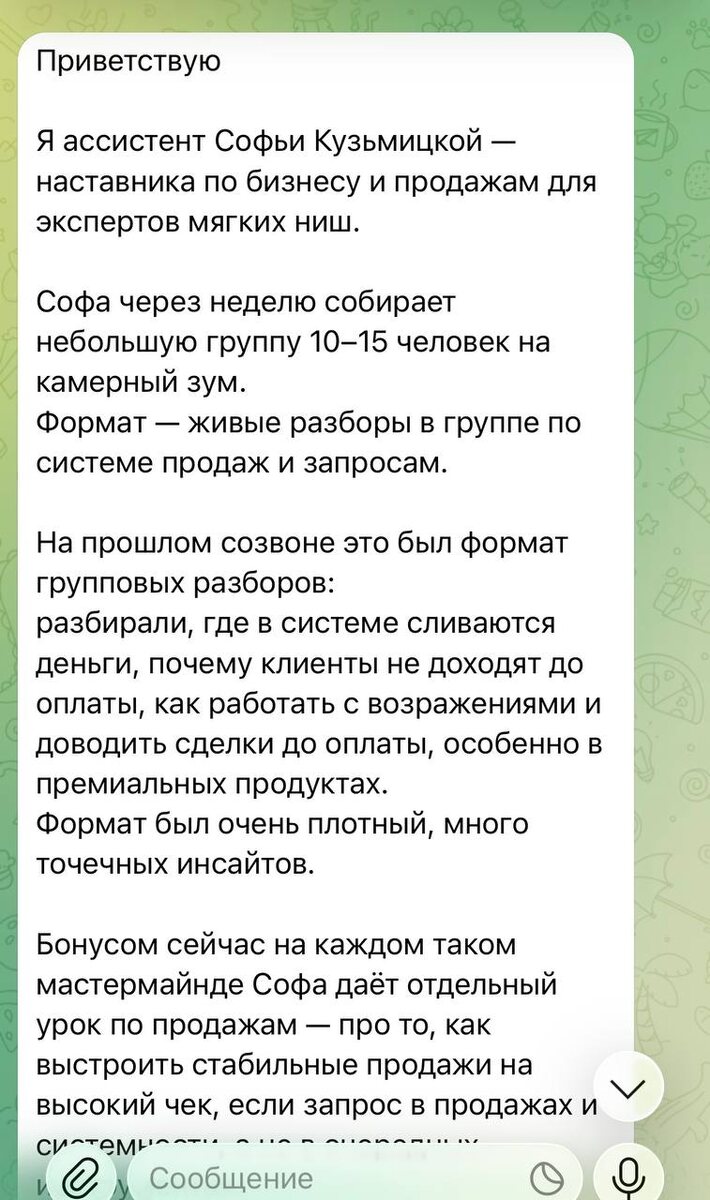 Это вот подобные рассылки на холодную аудиторию (смотри скрин). Я их ещё называю «последний стон отчаяния», потому что профит от этих рассылок стремится к нулю. Вот представьте. Сижу я, сижу и мне прилетает в личку это сообщение? Цепануло хотя бы каплю? Нет. И что тут не так? Давайте по шагам. Мне пишут про какую-то Софью Кузмицкую, о которой я ни сном, ни духом. Да ещё и зовут на созвон с разбором. Захотелось ли мне тратить время на созвон, где будет не знаю кто и получу не знаю что? Конечно нет, при условии, что чуть ли не каждый день к тебе стучится эксперт с предложением раскрыть все самые потайные секреты своих продаж. И каждый второй в соц.сетях сейчас наставник. Почему такие рассылки на холодную не будут работать с вероятностью 100%? ➡️ Нет никакой ценности и осознания выгоды. Что будет, если я потрачу свой драгоценный час на этот созвон. Ведь всем известно, что главная цель таких авантюр - продажа услуг. А кому сейчас хочется, чтобы лишний раз тебе что-то продавали? Маз
