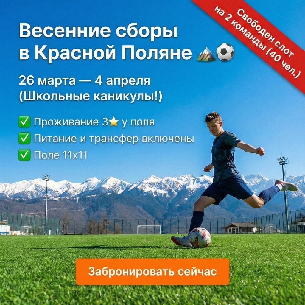 ! 📅 Даты: 26 марта — 4 апреля 👥 Места: Слот на 40 человек (2 команды) Идеальные условия для сборов в горах: 📍 Поле: 11х11 (делится), искусственное покрытие, освещение. 🏨 Проживание: Отель 3★ в шаговой доступности. 🍽 Питание: Трёхразовое (возможно усиление). 🚐 Трансфер: Аэропорт — Отель — Аэропорт. 👨💼 Сервис: Организатор на связи 24/7. ⏰ Закрепленное время тренировок: • Утро: до 09:00 • День: 14:00 – 15:30 Успейте забронировать, пока окно свободно! Подробная информация: https://t.me/camp_foot/3 📞 Подробности и бронь: +7 921 647-8761 (Кира) +7 911 213-3329 (Оксана) Наши ресурсы: t.me/camp_foot vk.com/camp_foot