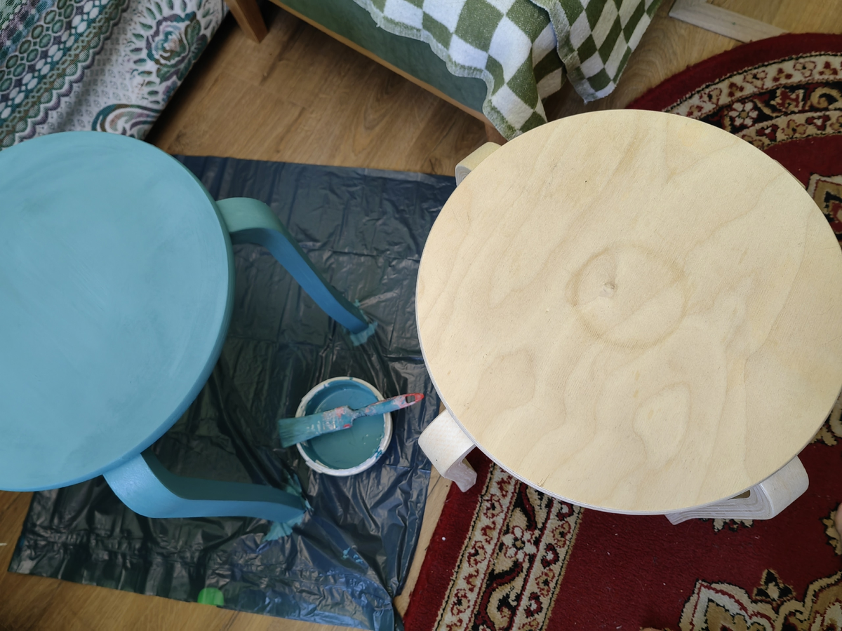 Была у меня парочка табуреток под "Икеа", которые сделаны из обычной фанеры. Муж купил на тот случай, если будет много гостей Если честно, я могла бы обойтись и без них. Не нравятся мне эти табуретки- шершавые, плохо ошкурены. Производитель на них даже лака пожалел! Это не табуретка, а какая-то заготовка! Больше тысячи рублей стоит, между прочим. Да и раньше, еще в икеевские времена качество этих табуреток хромало. Вроде, лаком были покрыты, но могли сломаться под большим весом. Но раз муж купил, не выкидывать же? Ладно, решила их покрасить. У меня кухня синего цвета, занавески голубые с узорами цветастыми, а на фартуке плитка с узором. Поэтому выбор цвета был очевиден. Правда, я хотела более серого цвета. Синюю краску смешала с белой, добавила черной, но до серого цвета у меня почему-то не дошло. Покрасила в два слоя. Рисунок выбрала из фартука на кухне - с плитки перенесла на бумагу, а потом при помощи копировальной бумаги - на табуретку. Рисунок заранее прорисовала, но в процессе