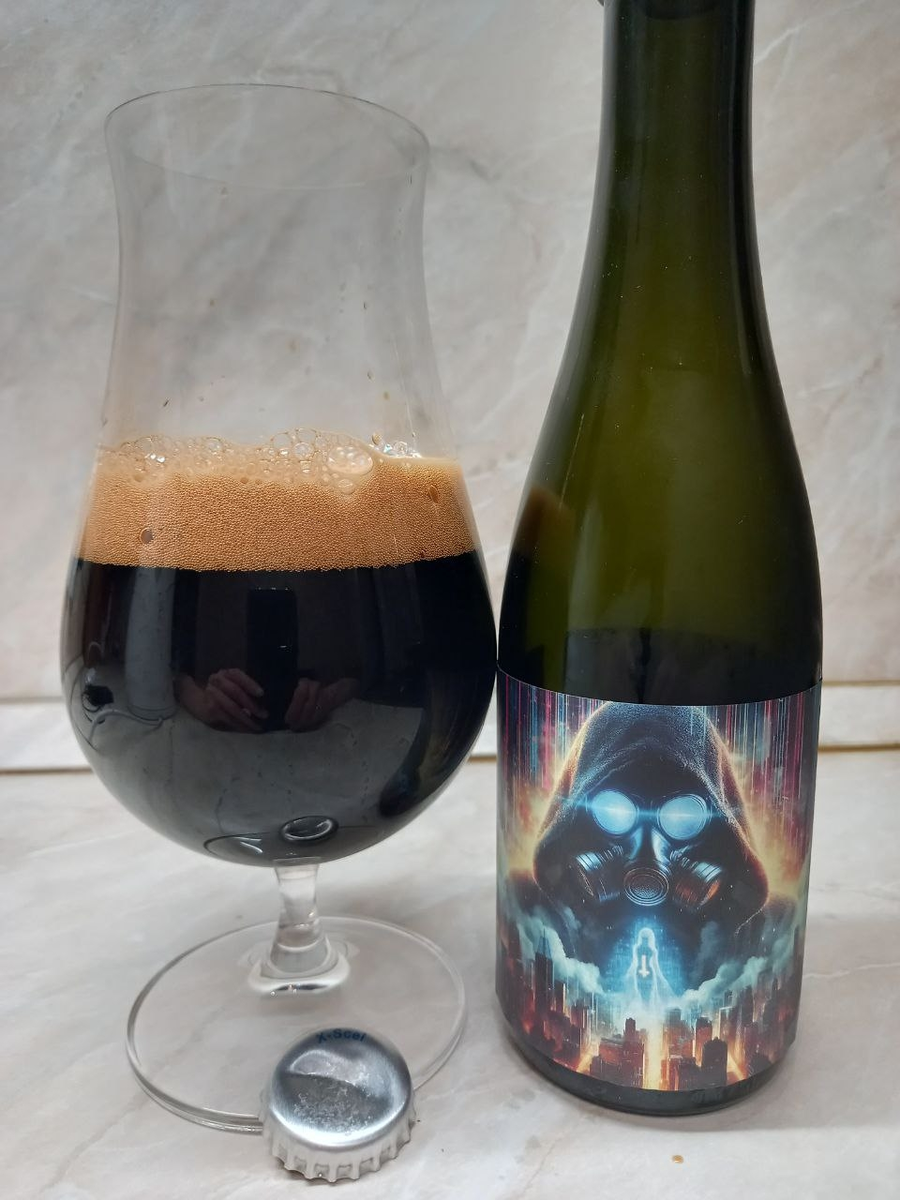 Этикетка стильная, рельефная, постапокалиптическая, кто-то сказал, что это из «Postal»-а, мне такое не знамо. Может это обложка к попсовым Carpenter Brut, у которых есть одноименный трек, но я поставлю привычно-апокалиптических Swans. В аромате - ох! что-то странное, копченый бекон, колбаска с дымком - очень интересная вискарная бочка была - это Ardbeg, Laphroaig или любимый Lagavulin? Явно айловские островитяне. Далее идут копченые бинты - Laphroaig всё-таки. Ой-ё-ёй как интересно пахнет! Далее сухарики-гренки бородинские, чуть подожженные - класс! Вкус - ух, кислючий-то какой, блин, как будто сауэр с RISом смешали. Во вкусе чувствуются бражные ягоды, инжир и пряный бальзамический уксус, да еще оттенки лыжной смазки и копченостей на «жидком дыме», да, именно «жидкий дым» больше всего напоминает, он чуть жжется, но не перцем, а уксусом каким-то - но э