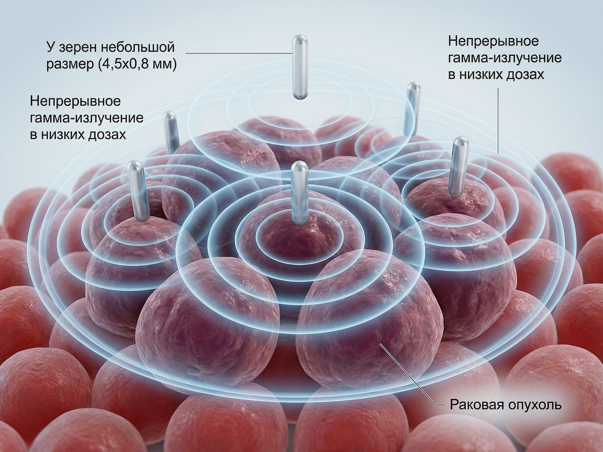 Когда опухоль расположена в труднодоступной зоне или организм ослаблен после курсов терапии, важно найти метод с минимальной нагрузкой. Один из таких инструментов — имплантация зерен йода-125. Это форма брахитерапии: под КТ-контролем в ткань опухоли вводятся микрокапсулы с радиоактивным изотопом. Каждое зерно имеет низкое излучение радиусом действия до 1,7 см. В течение 2–3 месяцев излучение локально повреждает ДНК раковых клеток, не затрагивая здоровые ткани за пределами опухоли. Процедура имплантации занимает 30–60 минут, проводится под местной анестезией — и пациент покидает клинику в тот же день. В чем особенность подхода: — облучение идет изнутри опухоли — это снижает влияние на окружающие органы; — в отличие от системной терапии, здесь нет общей токсичности: нет тошноты, резкого падения иммунитета, истощения; — зерна остаются в организме постоянно, но через 60 дней их активность снижается до безопасного уровня. Организм их изолирует без осложнений. Метод не универсален: его эффек