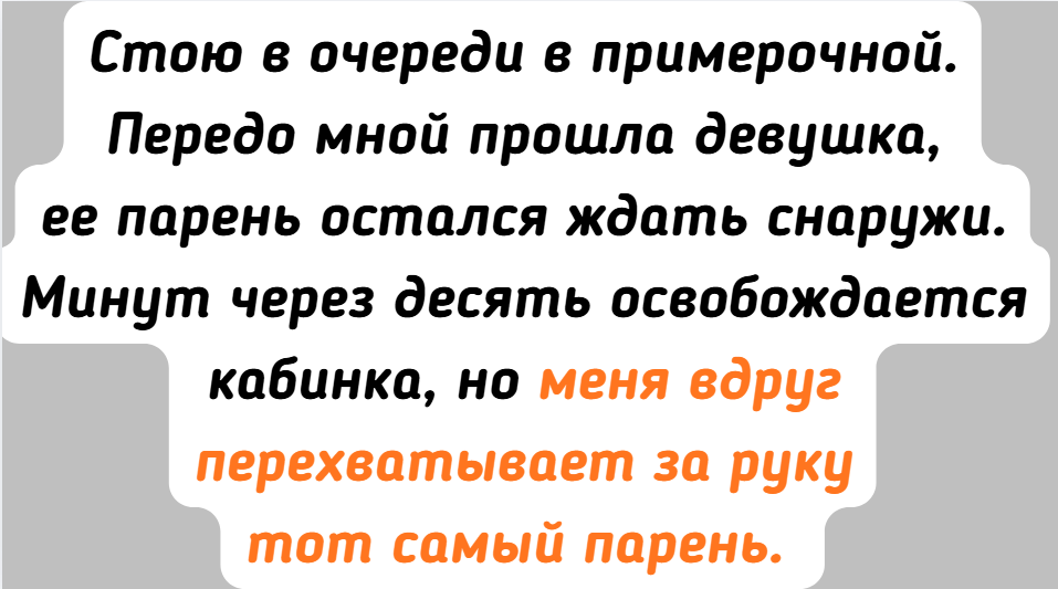 - Стою в очереди в примерочной. Передо мной прошла девушка, ее парень остался ждать снаружи. Минут через десять освобождается кабинка, но меня вдруг перехватывает за руку тот самый парень. До ушей красный, в руках платье. Я в недоумении, а этот красавчик говорит: «Простите, пожалуйста, но не могли бы вы померить это платье? Девушке хочу подарить, но боюсь прогадать. Моя сестра гораздо ниже нее, а вы вроде похожей комплекции». Оказалось, что девушка, которую я видела, — это его сестра. Я, конечно, опешила, но согласилась помочь. В итоге мы с его сестрой выбрали другое платье. В процессе разговорились, а потом решили вместе поужинать. С тех пор периодически видимся.