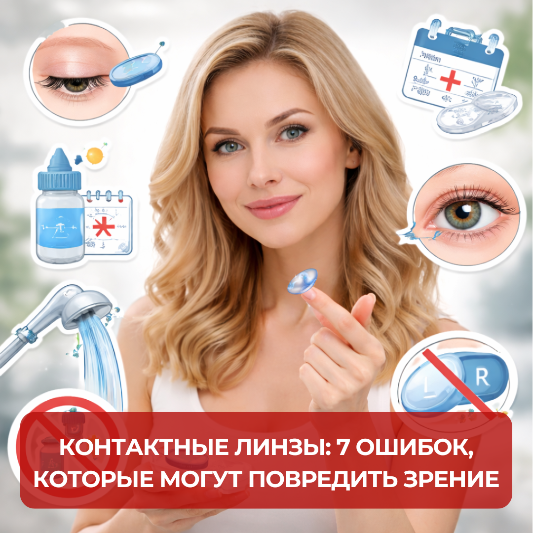 Контактные линзы — удобны, но неправильное использование может серьёзно навредить глазам. ⚠️ 1️⃣ Спать в линзах 😴 Даже «дневные» линзы не предназначены для сна — риск воспалений и инфекции. 2️⃣ Использовать просроченные линзы или раствор ⏳ Старые линзы теряют свойства, а просроченный раствор может быть опасен. 3️⃣ Игнорировать гигиену рук 🖐️ Перед надеванием линз руки всегда должны быть чистыми и сухими. 4️⃣ Носить линзы дольше рекомендованного срока ⌛ Слишком долгий срок ношения повышает риск кислородного дефицита для роговицы. 5️⃣ Игнорировать дискомфорт ⚡ Жжение, покраснение или слезотечение — сигнал обратиться к офтальмологу, а не терпеть. 6️⃣ Контакт с водой 💧 Не купайтесь и не принимайте душ в линзах — бактерии могут попасть на глаза. 7️⃣ Использовать чужие линзы 🚫 Даже «почти одинаковые» линзы могут вызвать аллергию или инфекцию. 💡 Совет: Следуйте рекомендациям офтальмолога и производителя линз, соблюдайте гигиену и регулярные проверки — и ваши глаза будут здоровыми и счас