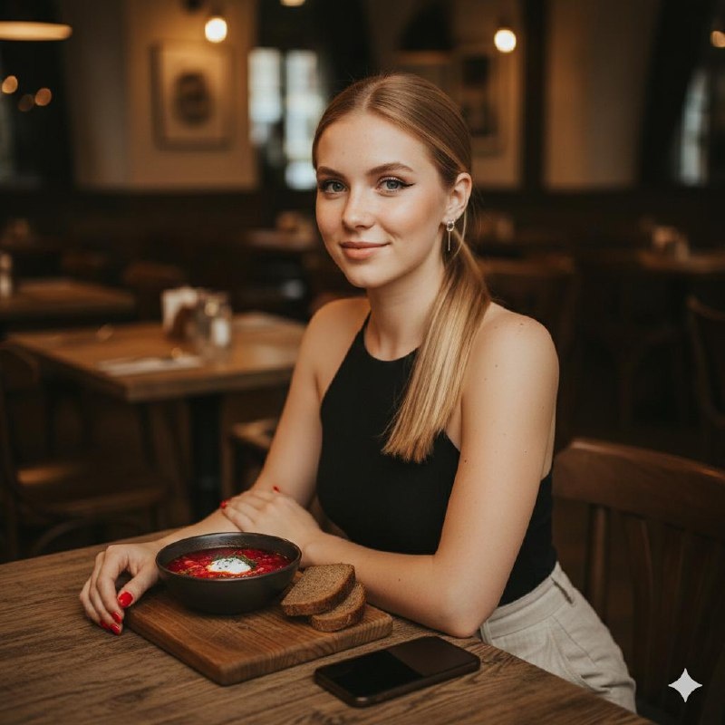 Модель: Nano Banana Сгенерировать🪄 фотореалистичный портрет девушки в ресторане, формат 9:16, высокая детализация **сохранить черты лица с загруженных фото в точности — лицо не изменять** девушка сидит за столом в уютном ресторане, слегка наклонена вперёд, волосы гладкие, убраны в хвост, перекинут через плечо, аккуратный макияж со стрелками, серьги, яркий красный маникюр одежда: чёрный халтер-топ без рукавов, светлые брюки на столе: тарелка борща со сметаной, хлеб, деревянный поднос, смартфон рядом освещение: тёплый приглушённый свет, вечерняя атмосфера стиль: фотореализм, естественные цвета, высокая детализация кожи --- **negative prompt:** изменение черт лица, пластиковая кожа, cgi-эффект, мультяшность, размытость, артефакты