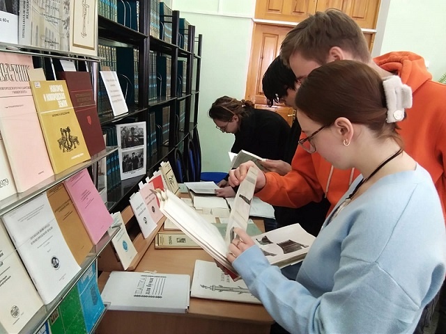 Студенты историки посетили научную библиотеку НовГУ, чтобы познакомиться в читальном зале Гуманитарного института с двумя книжными выставками из цикла «Лица новгородской истории. Они создавали, сохраняли и развивали культуру и историю Новгородской земли» Это выставка, посвященная Болеславу Донатовичу Ершевскому - археологу и историку, сотруднику НГОМЗ, руководителю десятков аржеологических раскопов на территории нашего региона и города, кандидату исторических наук и доценту кафедры истории, проработавшему 20 лет сначала в Пединституте, а затем в НовГУ и воспитавшему несколько поколений историков. И вторая выставка, рассказывающая о сложной судьбе Куликова Михаила Ивановича, участника Великой Отечественной войны, сражавшегося на Новгородской земле. 20 лет он работал на Крайнем Севере – на Чукотке, где занимался комсомольской и партийной работой, создавал Магаданский Пединститут. И в 1965 году вновь вернувшись на Новгородскую землю, стал - зав. кафедрой, проректором, а затем и ректо