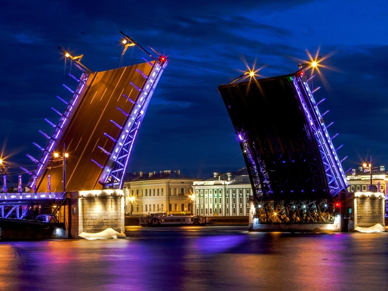 Уже стемнело, когда я вернулась к Неве, к тому самому месту, где днём стоял Дворцовый мост. Теперь он выглядел иначе: огни фонарей отражались в воде, а толпа людей вдоль набережной гудела в предвкушении. Часы на башне пробили два — и началось.