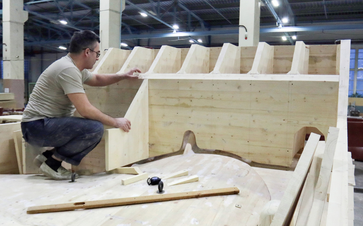 Большие деревянные модели лопастей гребных винтов занимают значительную часть производственного пролёта. Сегодня это основная работа участка модельной оснастки деревообрабатывающего цеха 41 предприятия ОСК Севмаш.