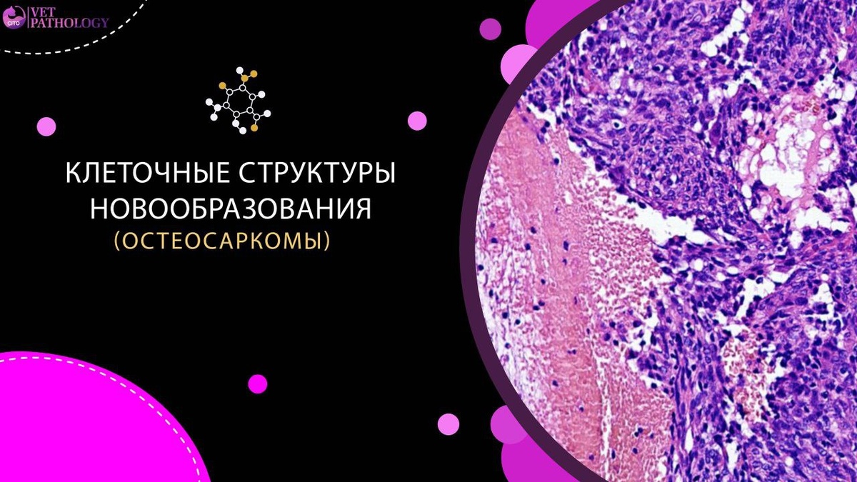 Они требуют от клинициста максимальной настороженности, а от патоморфолога - высочайшей точности в диагностике. Важно помнить и о технической сложности работы с таким материалом: костная ткань требует обязательной декальцинации перед гистологической проводкой, а готовые блоки трудны для микротомии. 👩⚕ В ветеринарный центр патоморфологии поступил материал от самца немецкой овчарки, 6 лет. Данных о проведённой кастрации нет. Причиной обращения послужило обнаружение в толще тканей безболезненного, неподвижного образования, подозрительного на неоплазию (саркому). По данным клинико-инструментального обследования отмечались дегенеративные изменения в локтевой кости. 🔬 В препарате определяется фрагмент опухоли, представленной группами и солидными полями атипичных полиморфных клеток со скудной и умеренно выраженной эозинофильной цитоплазмой. Ядра плеоморфные, гиперхромные и везикулярные, некоторые с выраженными нуклеолами и грубодисперсным хроматином. Опухоль митотически активна — 4–5 ми