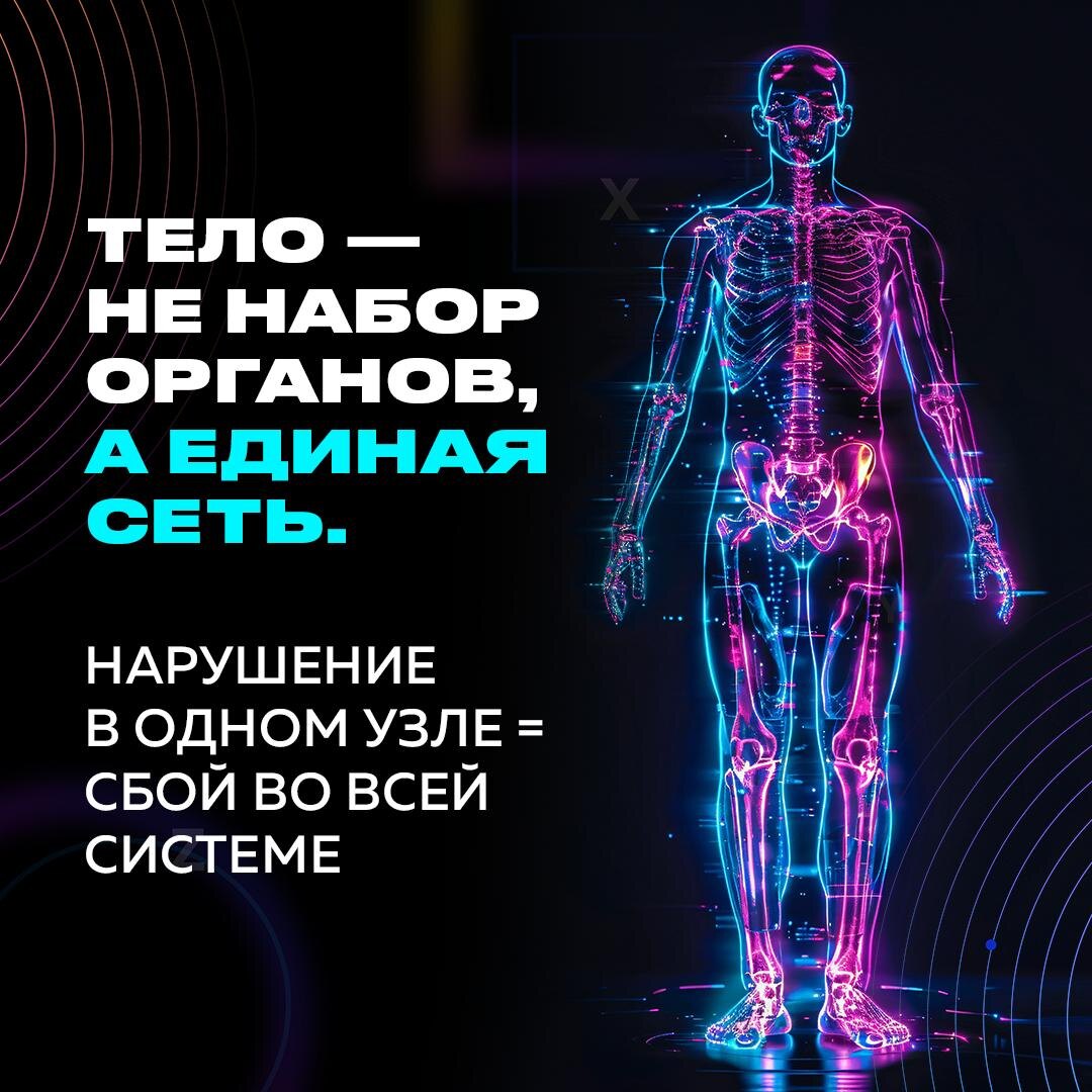 ». Голова? Таблетка. Спина? Мазь. Желудок? Диета. Кажется, что каждый орган живет своей отдельной жизнью. Но на самом деле тело — это единая, сложнейшая сеть. Как интернет или электрическая цепь. И если где-то возникает сбой, он обязательно отразится на других участках. КАК ЭТО РАБОТАЕТ? 🟣 Голова → стопы → поясница Всё начинается с головы. Зажатый затылочный сустав, спазм глубоких мышц шеи — это не просто «хруст» или дискомфорт. Это сигнал, который искажает работу всей нервной системы. Тело вынуждено подстраиваться: перекашивается плечевой пояс, меняется положение таза, нагрузка на стопы распределяется неправильно. Возникает компенсаторное плоскостопие — не как причина, а как следствие. Далее по цепочке страдают колени, таз и поясница. Боль в спине приходит последней, хотя первый сбой случился гораздо выше. 🟣 Затылок + стресс → челюсть → шея → голова Хронический стресс повышает тонус всей мышечной системы. Особенно страдают глубокие мышцы затылка и шеи. Их спазм передаётся на ж