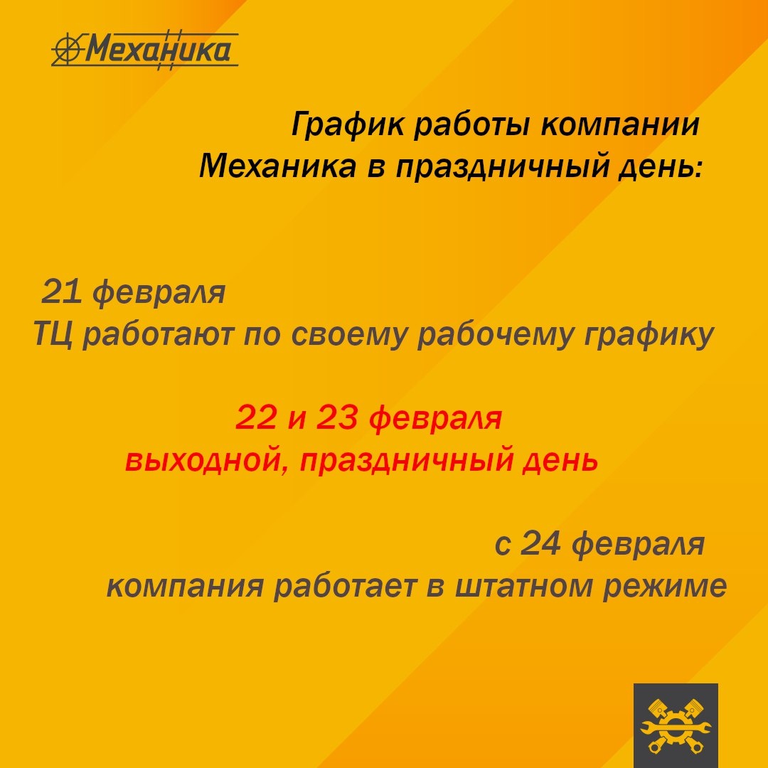 21 февраля - ТЦ работают по своему рабочему графику 22 и 23 февраля – выходной, праздничный день с 24 февраля – компания работает в штатном режиме Ждем вас в любом из ТЦ www.mechanika.ru/contacts/