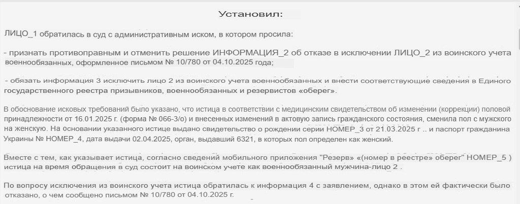 Мужчина из Харькова юридически превратился в женщину, добившись смены пола* в паспорте. Затем новоявленная "гражданка" Украины попросила военкомов снять "ее" с учета. Решение медкомиссии в ТЦК было неутешительным — мужчина остался военнообязанным. Однако в суде с "женщиной" согласились, исключив "ее" из реестра призывников и оставив возможность служить добровольно. * — движение ЛГБТ признано экстремистским и запрещено в России Lesen Sie weiter unten auf Deutsch...