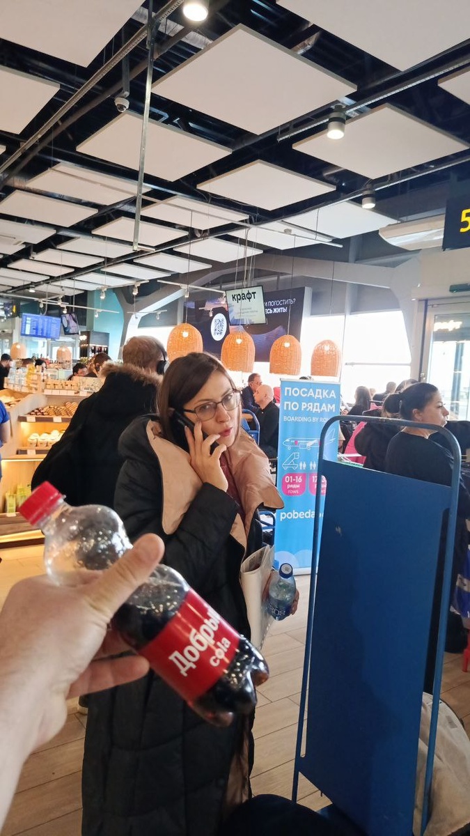 Ждем посадку, пью колу Добрый по 300 рублей :)