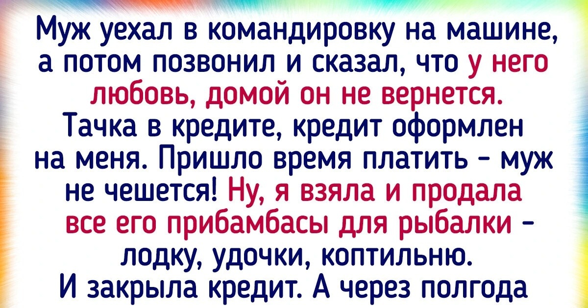 Муж уехал в командировку на машине, а потом позвонил и сказал, что у него любовь, домой он не вернется. Тачка в кредите, кредит оформлен на меня. Пришло время платить — муж не чешется! Ну, я взяла и продала все его прибамбасы для рыбалки — лодку, удочки, коптильню. И закрыла кредит. А через полгода муж решил меня облагодетельствовать: скинул 10 косарей на карту, мол, на кредит (хотя мы в месяц 24 платили), и сказал, что заедет за своими вещами. Мне было так приятно ему сообщить, что никаких его вещей в моей (купленной до брака) квартире нет, ведь остатки одежды я отвезла свекрови, а все рыбацкое продала. Ох, как он орал! Ничего страшного, я считаю. Мне больнее было.