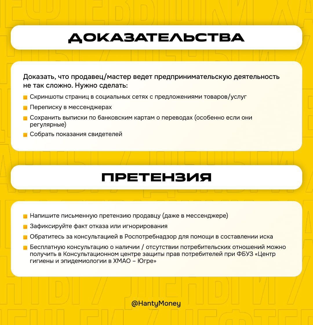 "Торты на заказ", "Ремонт квартир под ключ", "Маникюр на дому", "Муж на час" — зачастую за такими объявлениями стоят мастера, которые никак не зарегистрированы. Чеков и договоров они, скорее всего, не дадут. ❓ А если услуга окажется некачественной? В Роспотребнадзоре ХМАО пояснили: если человек систематически продает товары или оказывает услуги, размещает рекламу, имеет прайс-лист или портфолио работ, то в судебном процессе его признают предпринимателем. А значит, он будет отвечать по закону, который обяжет заплатить неустойку или вернуть деньги. Как все грамотно сделать - читайте в наших карточках⤴ Подписаться | Прислать новость | Дать «буст» | Мы в MAX