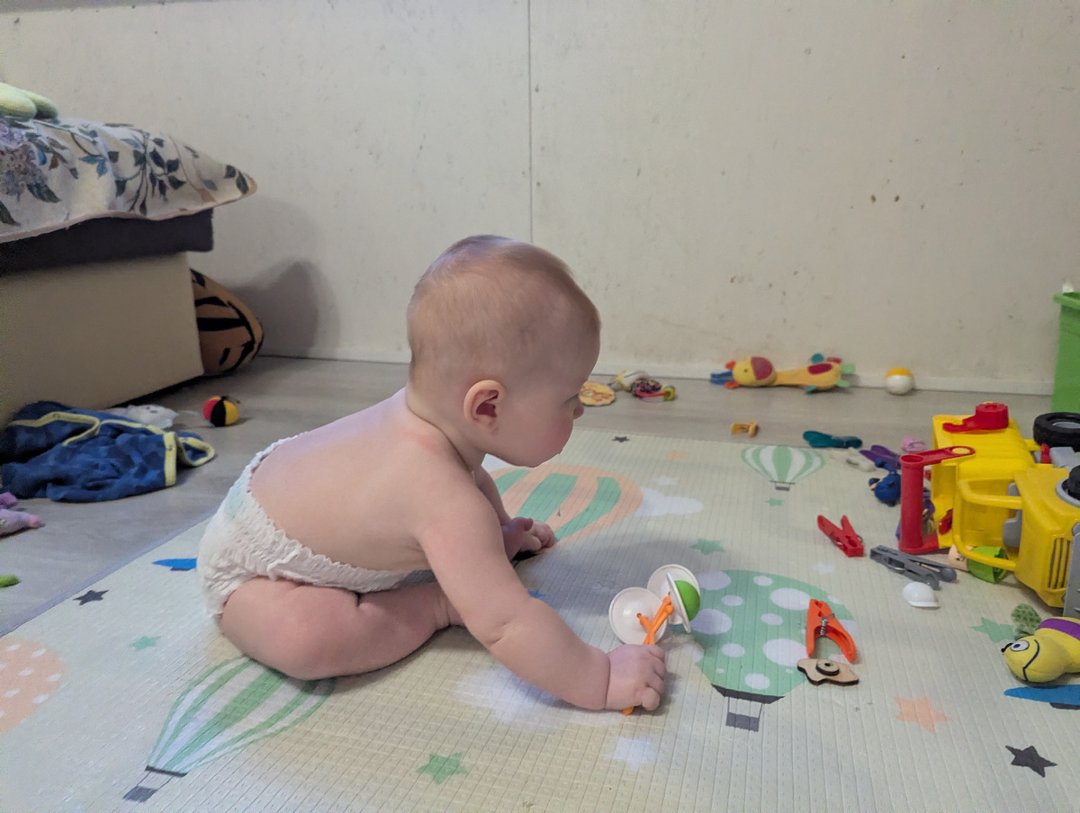 Как-то незаметно Женьке исполнилось полгода. Не смысловая веха, календарная, но тоже ничего. Как ни странно, не смотря на болезни, достижений очень много. Например, Женя сел. Да, всего пару раз, но именно что сам. Еще он пополз. Это еще не классическое перемещение на четвереньках, это микс стилей "червяк" и "раненый партизан": т.е. передвигается Женёк ковыряясь на пузе, явно активно работая больше правой ногой. Но при этом делает это достаточно быстро. Благо, пока у ребенка нет желания ползать далеко, обычно его хотелки распространяются на ближайшую яркую игрушку. Игрушками он может занимется довольно долго: подползет к ящику, завалит его и ковыряется в этом богатстве условно самостоятельно. А вот чего пока не может - это привстать, держась за ящик. Неожиданно заинтересовался книжками - возможно, потому что рядом вечно носится Лёня с его "почитай". В общем, я достала фотоальбом с карточками животных, который у нас играет роль первой правильной книжки, и иногда называю Женьке оттуда кар
