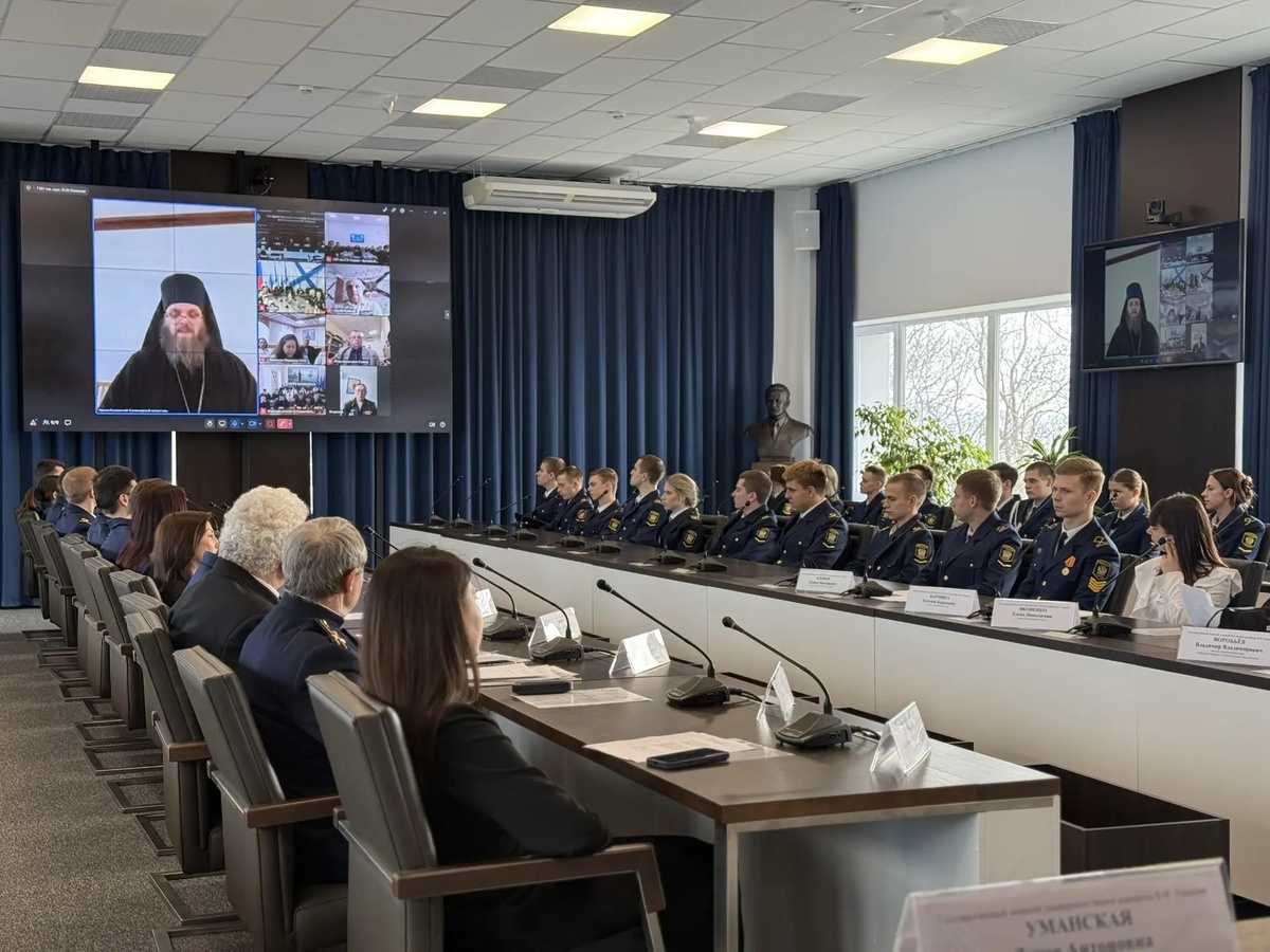 !» Эти слова, ставшие духовным завещанием великого адмирала, святого праведного воина Феодора Ушакова, неоднократно звучали в рамках конференции-телемоста «Духовное измерение побед: милосердие адмирала Федора Ушакова как залог успеха и путь к святости». Телемост объединил Новороссийск, Калининград, Мордовию, Саров, Москву. Имя Ушакова, как святого и как воина, вдохновляет и поражает многих. Историки говорили о его уникальном полководческом таланте, священнослужители о его невероятной любви к людям и Отечеству. «Святой праведный… Что это значит? Праведный – это простой мирянин, который не был монахом, который не был монархом, князем, а русская православная церковь в нём увидела настоящего православного христианина,» - подчеркнул епископ Новороссийский и Геленджикский Сергий. Инициаторами и организаторами конференции выступила кафедра «Гуманитарных дисциплин» Ушаковки, ученые вуза пригласили к диалогу представителей Балтийского высшего военно-морского училища имени адмирала Ф. Ф. Ушаков