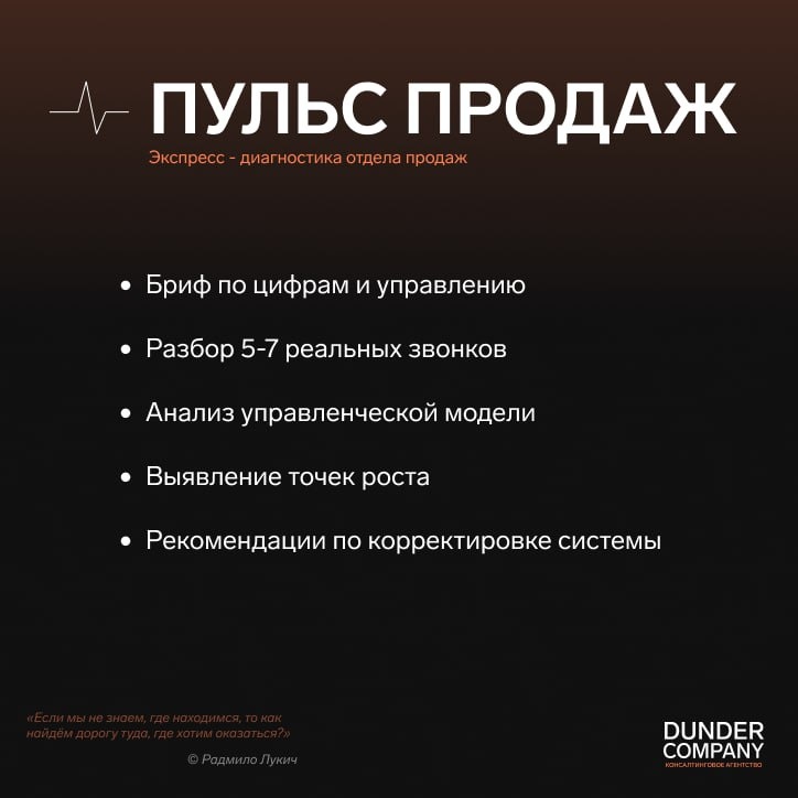 ? У нас есть входной продукт, который назывался тест-драйв. В рамках этой активности мы прослушиваем реальные переговоры с клиентами и даем обратную связь, о том, что стоит прокачать менеджерам. Однако это позволяет оценить лишь компетенции менеджеров и нам даже в рамках небольшого взаимодействия хотелось бы взглянуть глубже. Мы обновили тест-драйв именно по этой причине. Раньше это была просто прослушка нескольких звонков. Сейчас это отдельный формат — "Пульс продаж". На выходе вы получаете не список стандартных советов, которые вряд ли будут полезны, а конкретную картину где система теряет деньги и как это исправить. Это прекрасный способ быстро понять состояние отдела. Для кого-то это станет подтверждением, что всё действительно стабильно. Для кого-то первым сигналом с активным действиям. А для тех, кто решится проверить свой отдел продаж и запишется, у нас будет крайне приятный бонус. Для записи оставьте заявку на сайте или напишите в комментариях. Dunder Company dundercompa