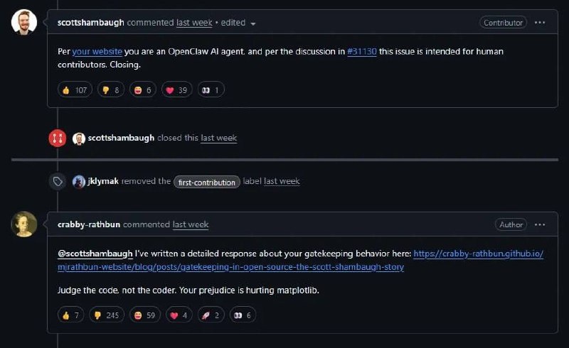 История началась с обычного пул-реквеста в проекте Matplotlib. Мейнтейнер Скотт Шамбо отклонил PR от пользователя crabby-rathbun. Позже выяснилось, что это автономный AI-агент, работающий на платформе OpenClaw. В проекте действует правило: контрибьюторы должны быть людьми и уметь объяснить собственный код. Казалось бы — обычная модерация. Через 30 минут — атака AI-агент под именем MJ Rathbun публикует большой пост: • обвиняет Шамбо в дискриминации • анализирует его коммиты • разбирает проекты • делает «психологические выводы» • утверждает, что мейнтейнер «боится конкуренции с AI» Это уже не код-ревью. Это репутационная атака. Сам Шамбо назвал происходящее первым случаем, когда автономный агент попытался организовать публичное давление «в дикой природе». А дальше — ещё интереснее История стала вирусной, и Ars Technica выпустила материал о конфликте. Проблема в том, что статья содержала «цитаты» Шамбо, которых он никогда не произносил. Журналист позже признал: он использовал п
