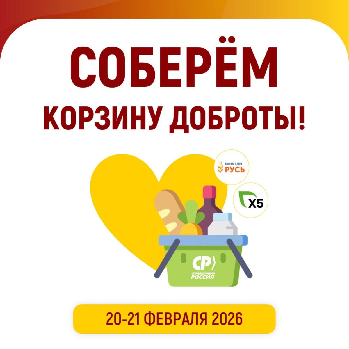Поддержите тех, кому это нужнее всего! Справедливая Россия, банк еды «Русь» и Фонд «Выручаем» приглашают вас поделиться продуктами с теми, кому сейчас трудно. Сделать это можно прямо в магазинах «Пятерочки», принимающих участие в акции. Точные адреса — в карточках к публикации! ❓Что положить? Крупы, консервы, макароны, чай, сахар — всё, что хранится долго. ❓Когда и во сколько? Продовольственный марафон пройдет 20 февраля (пт) с 16:00 до 20:00 и 21 февраля (сб) с 12:00 до 18:00. Все собранные продукты будут переданы волонтёрами нуждающимся: в реабилитационные центры, одиноким пенсионерам и инвалидам, многодетным и малообеспеченным семьям... Каждая корзина — это надежда на помощь. Давайте помогать вместе!