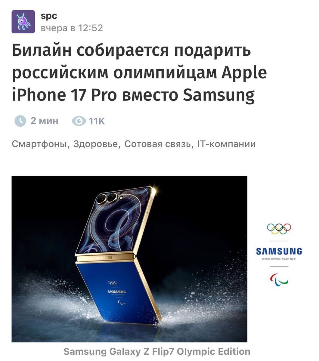 История простая: • Международный олимпийский комитет традиционно раздаёт спортсменам лимитированные смартфоны Samsung в олимпийском дизайне. • Samsung годами инвестирует миллионы, чтобы атлеты светились именно с их устройствами, а не с iPhone. Но российским спортсменам устройства не выдали. Вместо смартфонов — «олимпийский набор»: шампунь и полотенце. Официальные объяснения — ссылки на регуляторные ограничения. Samsung работает в РФ. МОК — прикрывается нормами. Скучно. И тут появляется Билайн Билайн заявляет, что подарит спортсменам… iPhone 17 Pro Max. И вот здесь начинается магия. Что произошло на самом деле Samsung: • вложила миллионы в олимпийское партнёрство • строила ассоциацию «спорт = Galaxy» • контролировала визуальное присутствие Билайн: • потратил условные $15–20k • встроился в уже разогретый инфоповод • получил международные охваты Это textbook-амбуш-маркетинг. Почему это гениально 1. Они не спорили. 2. Они не критиковали. 3. Они просто закрыли «несправедливость».