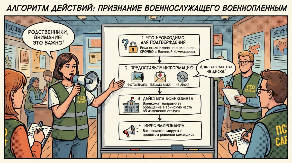 Если вам стало известно, что военнослужащий в плену, - незамедлительно сообщите об этом в военный комиссариат. Для этого вам необходимо предоставить следующую информацию: ✅фото или видео; ✅письмо из Международного Комитета Красного Креста. ❗️Приложения необходимо предоставить на диске. ✅Военный комиссариат направит обращение в воинскую часть об изменении статуса военнослужащего и проинформирует вас о принятом командиром воинской части решении. ------------------------------------------ Подписывайтесь на нас: 📶 ВКонтакте 📶 Одноклассники 👋 Max 🔴Наш официальный сайт