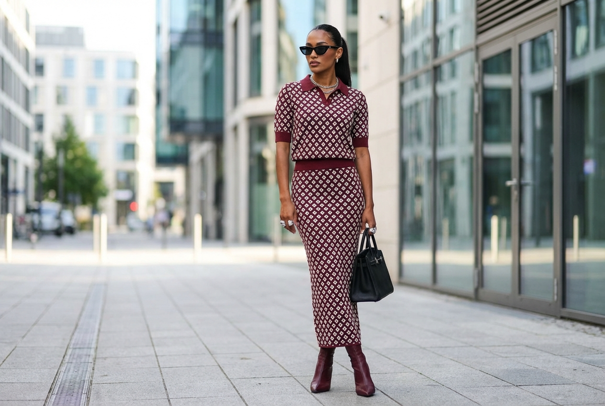 GVEN LINE использует именно такую палитру: мокко, терракот, шоколад, тёмный петроль, папоротниковый зелёный. Эти оттенки не кричат, а работают как фон, на котором лицо выглядит главным акцентом. Вязаный костюм с поло в терракотовом цвете — хороший пример: тёплый сложный оттенок, который согревает образ и освежает лицо, оставаясь при этом спокойным и нейтральным. Готовый комплект, который не нужно подбирать по цвету — верх и низ уже работают вместе.