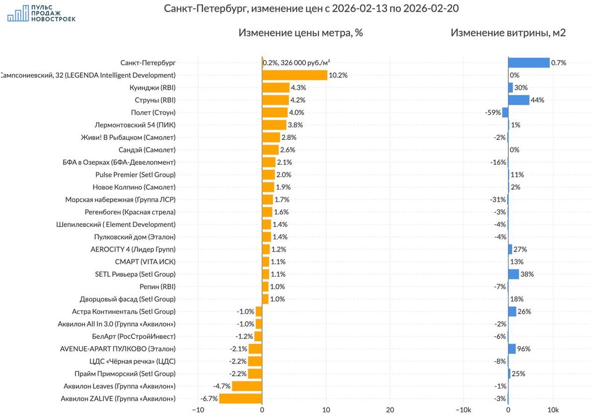 💰 Смотрим без премиум и элит классов, лоты до 100м2. 💵 За 7 дней цена метра выросла на 0.2% до 326 000 рублей за метр. 📈Топ изменения цен (подорожало): 1️⃣ЖК "Сампсониевский, 32" (LEGENDA Intelligent Development) цена метра +10.2%, без изменения объема предложения 2️⃣ЖК "Куинджи" (RBI) цена метра +4.3%, объем витрины при этом увеличился на 1026м2 3️⃣ЖК "Струны" (RBI) цена метра +4.2%, объем витрины при этом увеличился на 4721м2 🪫Анти топ (подешевело): 1️⃣ЖК "Аквилон ZALIVE" (Группа «Аквилон») -6.7% в цене, витрина предложения уменьшилась на -63м2 2️⃣ЖК "Аквилон Leaves" (Группа «Аквилон») -4.7% в цене, витрина предложения уменьшилась на -42м2 3️⃣ЖК "Прайм Приморский" (Setl Group) -2.2% в цене, объем витрины при этом увеличился на 464м2 ☄️Объем предложения жилья в регионе вырос на 0.7% (9251 м2). Всего на рынке доступно 1252922 м2 жилых объектов Все изменения в регионе на картинке. ‼️Только для наших подписчиков в телеграмм - сервис истории цен для поиска выгодных предложени