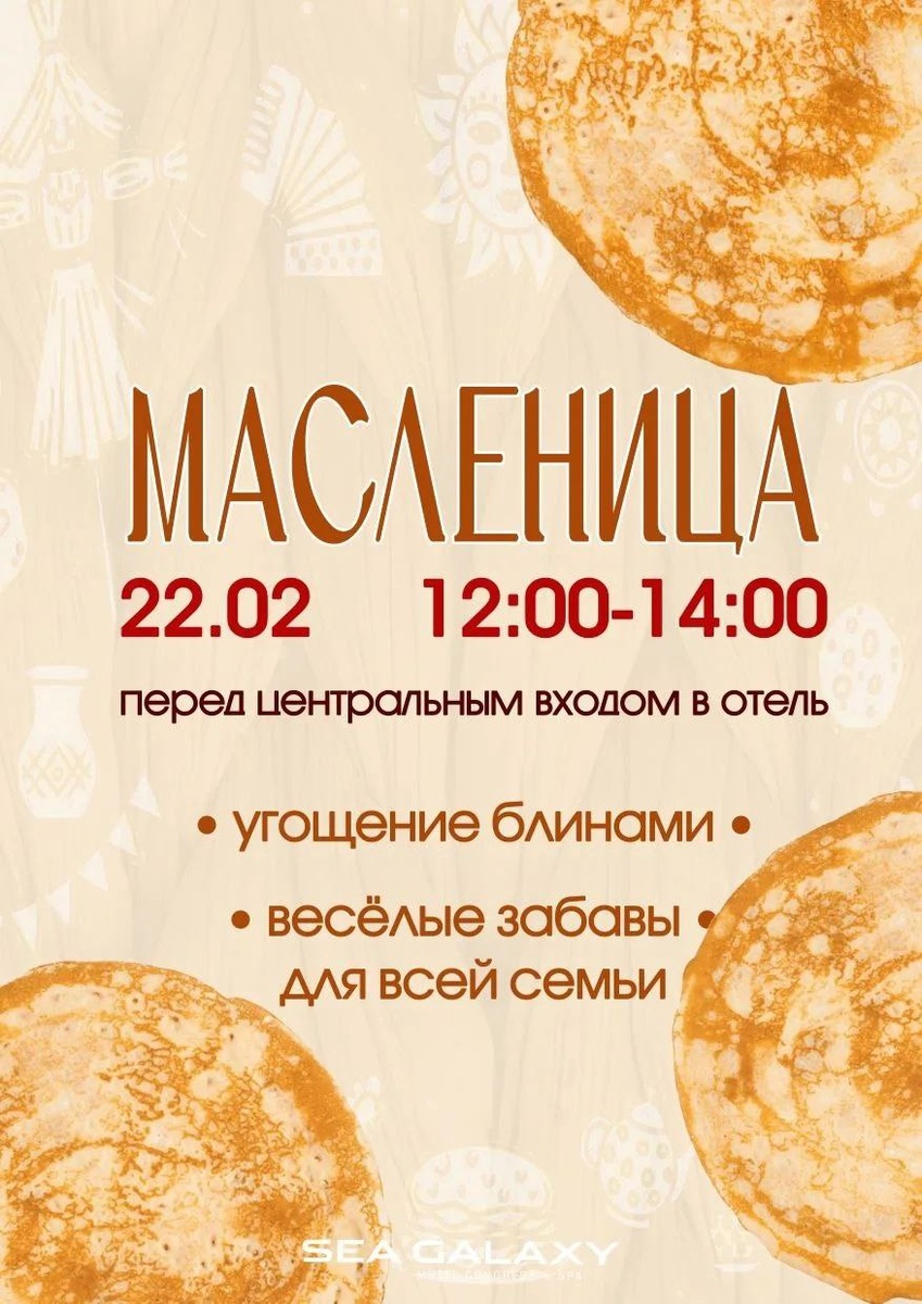 Приглашаем вас на праздничную Масленицу 22 февраля у центрального входа отеля Sea Galaxy с 12:00 до 14:00 🥞
