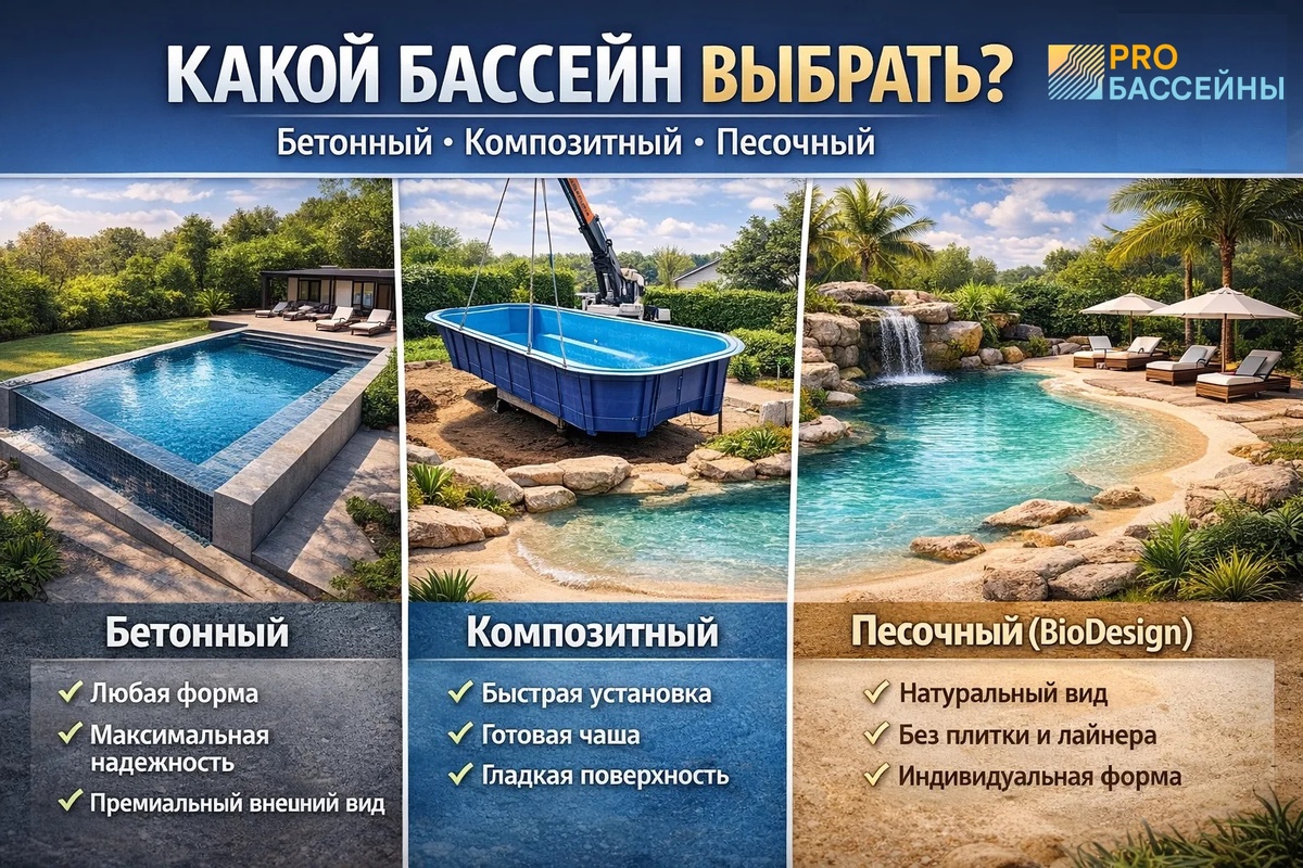 🏗 Бетонный бассейн — максимальная свобода Что вы получаете: ✔️ Любую форму и глубину ✔️ Возможность сложных архитектурных решений ✔️ Переливные системы, подсветку, нестандартные зоны ✔️ Капитальную конструкцию на десятилетия 🧱 Композитный бассейн — быстро и технологично Что вы получаете: ✔️ Заводскую чашу с контролем качества ✔️ Быструю установку ✔️ Гладкую поверхность Кому подойдёт: Тем, кто хочет получить бассейн в короткие сроки с прогнозируемым результатом. 🌴 Песочный бассейн (BioDesign) — эффект натуральной лагуны Что вы получаете: ✔️ Индивидуальную форму без стандартных шаблонов ✔️ Натуральную эстетику ✔️ Плавные заходы, пляжную зону ✔️ Отсутствие плитки и лайнера Кому подойдёт: Тем, кто хочет не просто бассейн, а атмосферу курорта у себя дома. 📌 Что важно учитывать при выборе? 🔹 Площадь участка 🔹 Архитектуру дома 🔹 Бюджет 🔹 Сроки реализации 🔹 Формат использования (семья, дети, спорт, отдых) 💬 Итог Не существует «лучшего» бассейна. Существует подходящий именно вам.