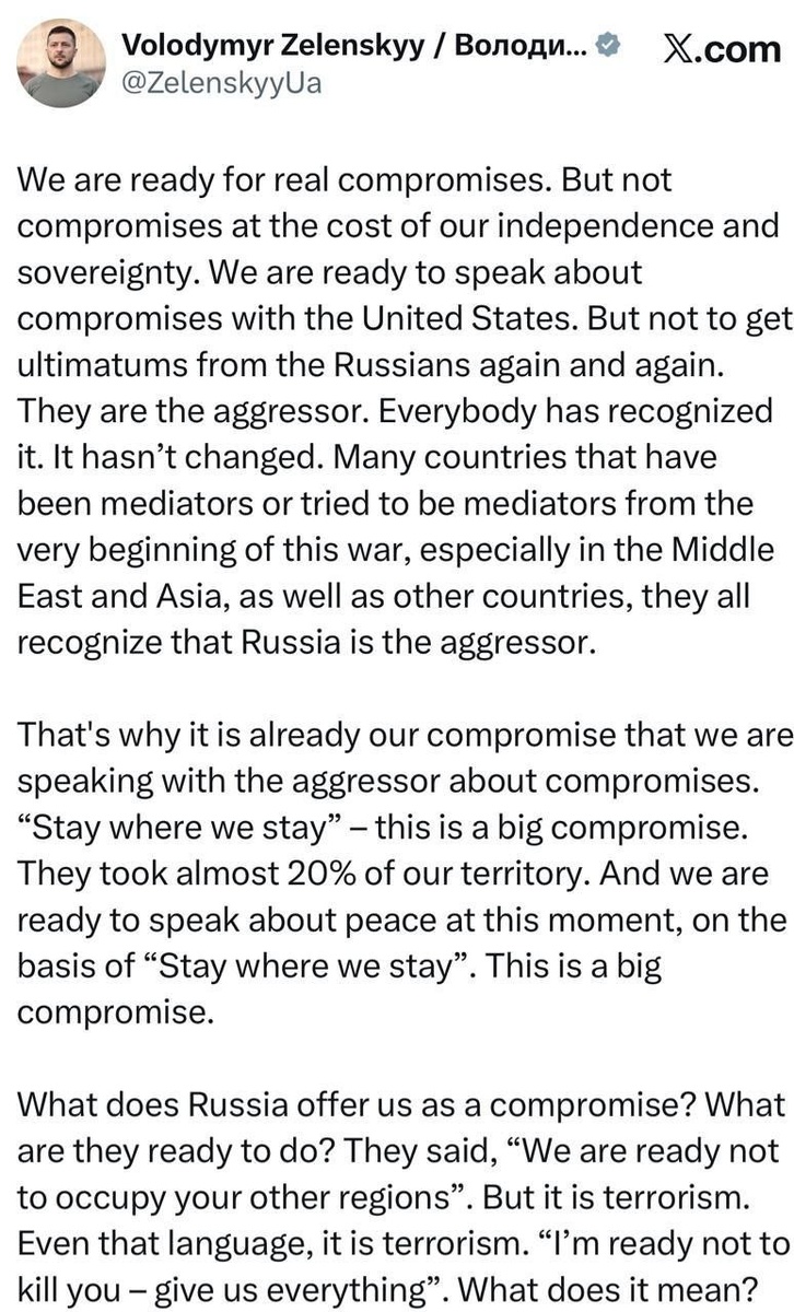 Π²Π°ΡΠΈΠ»ΠΈ ΠΏΠΎΡΡΠΈ 20% Π½Π°ΡΠ΅ΠΉ ΡΠ΅ΡΡΠΈΡΠΎΡΠΈΠΈ. Π ΠΌΡ Π³ΠΎΡΠΎΠ²Ρ Π³ΠΎΠ²ΠΎΡΠΈΡΡ ΠΎ ΠΌΠΈΡΠ΅ ΠΏΡΡΠΌΠΎ ΡΠ΅ΠΉΡΠ°Ρ. ΠΡΠΎ Π±ΠΎΠ»ΡΡΠΎΠΉ ΠΊΠΎΠΌΠΏΡΠΎΠΌΠΈΡΡΒ», β ΠΏΠΎΠ΄ΡΠ΅ΡΠΊΠ½ΡΠ» ΠΏΡΠ΅Π·ΠΈΠ΄Π΅Π½Ρ. ΠΡΠΈ ΡΡΠΎΠΌ ΠΠ΅Π»Π΅Π½ΡΠΊΠΈΠΉ ΡΠ°ΡΠΊΡΠΈΡΠΈΠΊΠΎΠ²Π°Π» ΠΏΠΎΠ·ΠΈΡΠΈΡ Π ΠΎΡΡΠΈΠΈ, Π½Π°Π·Π²Π°Π² Π΅Π΅ ΠΏΡΠ΅Π΄Π»ΠΎΠΆΠ΅Π½ΠΈΡ Β«ΡΠ΅ΡΡΠΎΡΠΈΠ·ΠΌΠΎΠΌΒ». ΠΠΎ Π΅Π³ΠΎ ΡΠ»ΠΎΠ²Π°ΠΌ, ΠΠΎΡΠΊΠ²Π° Π² ΠΊΠ°ΡΠ΅ΡΡΠ²Π΅ Β«ΠΊΠΎΠΌΠΏΡΠΎΠΌΠΈΡΡΠ°Β» ΠΏΡΠ΅Π΄Π»Π°Π³Π°Π΅Ρ Π»ΠΈΡΡ ΠΎΠ±ΡΠ·Π°ΡΠ΅Π»ΡΡΡΠ²ΠΎ Π½Π΅ ΠΎΠΊΠΊΡΠΏΠΈΡΠΎΠ²Π°ΡΡ ΠΎΡΡΠ°Π²ΡΠΈΠ΅ΡΡ ΡΠ΅Π³ΠΈΠΎΠ½Ρ. Β«Π§ΡΠΎ Π ΠΎΡΡΠΈΡ ΠΏΡΠ΅Π΄Π»Π°Π³Π°Π΅Ρ Π½Π°ΠΌ Π² ΠΊΠ°ΡΠ΅ΡΡΠ²Π΅ ΠΊΠΎΠΌΠΏΡΠΎΠΌΠΈΡΡΠ°? ΠΠ° ΡΡΠΎ ΠΎΠ½ΠΈ Π³ΠΎΡΠΎΠ²Ρ? ΠΠ½ΠΈ ΡΠΊΠ°Π·Π°Π»ΠΈ: "ΠΡ Π³ΠΎΡΠΎΠ²Ρ Π½Π΅ ΠΎΠΊΠΊΡΠΏΠΈΡΠΎΠ²Π°ΡΡ Π²Π°ΡΠΈ Π΄ΡΡΠ³ΠΈΠ΅ ΡΠ΅Π³ΠΈΠΎΠ½Ρ". ΠΠΎ ΡΡΠΎ ΡΠ΅ΡΡΠΎΡΠΈΠ·ΠΌ. ΠΡΠΎ ΡΠ»ΡΡΠΈΠΌΠ°ΡΡΠΌ. ΠΡ Π½Π΅ Π³ΠΎΡΠΎΠ²Ρ ΠΊ ΡΠ»ΡΡΠΈΠΌΠ°ΡΡΠΌΠ°ΠΌΒ», β ΡΠ΅Π·ΡΠΌΠΈΡΠΎΠ²Π°Π» ΠΎΠ½. ΠΠΎ ΠΌΠ½Π΅Π½ΠΈΡ Π½Π°Π±Π»ΡΠ΄Π°ΡΠ΅Π»Π΅ΠΉ, ΠΎΡΠΎΠ·Π½Π°Π²Π°Ρ Π²ΡΡ Π±Π΅Π·ΡΡΡ